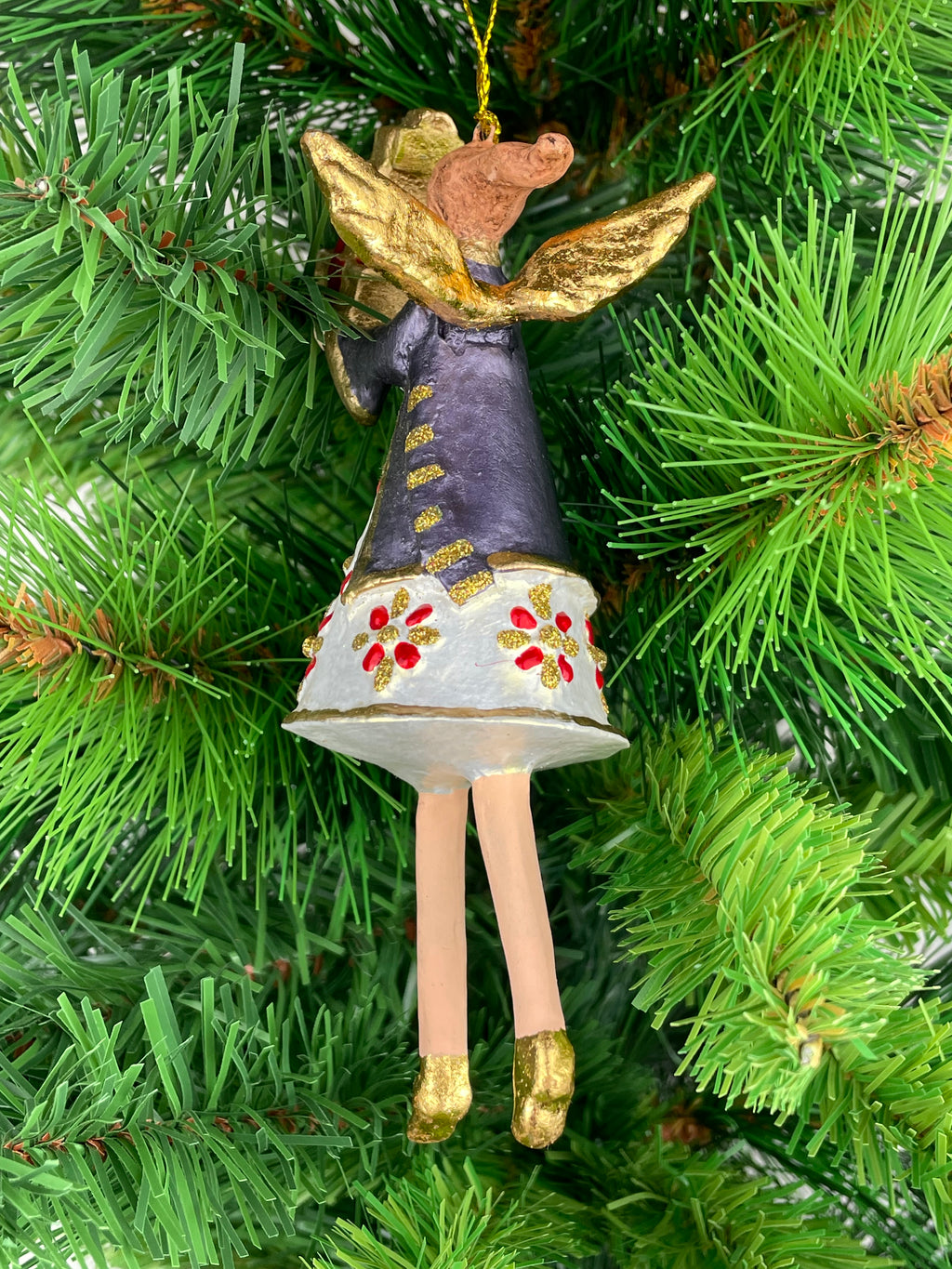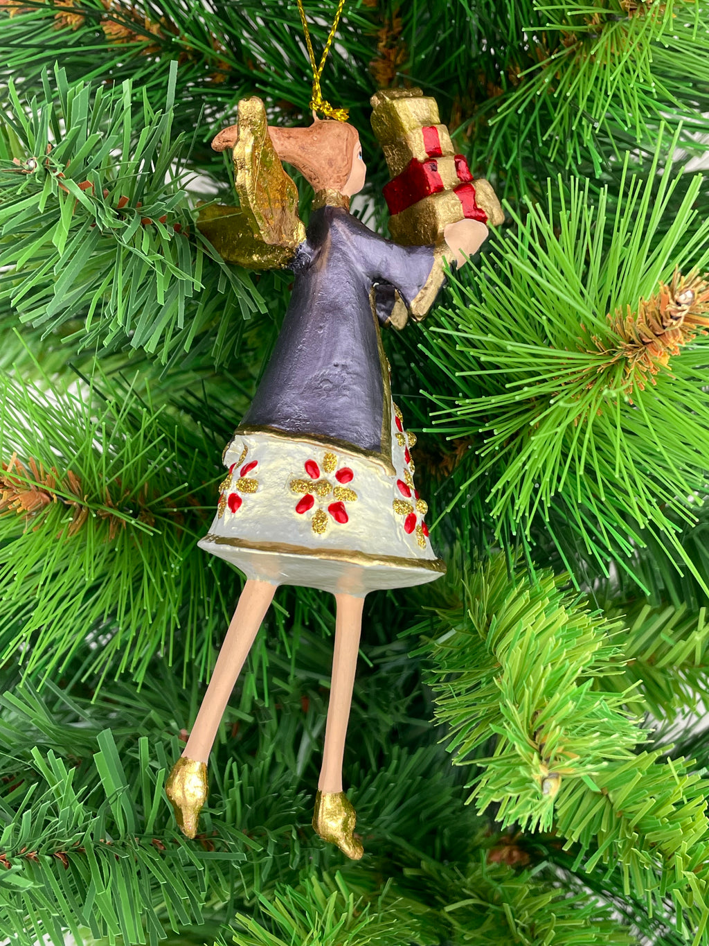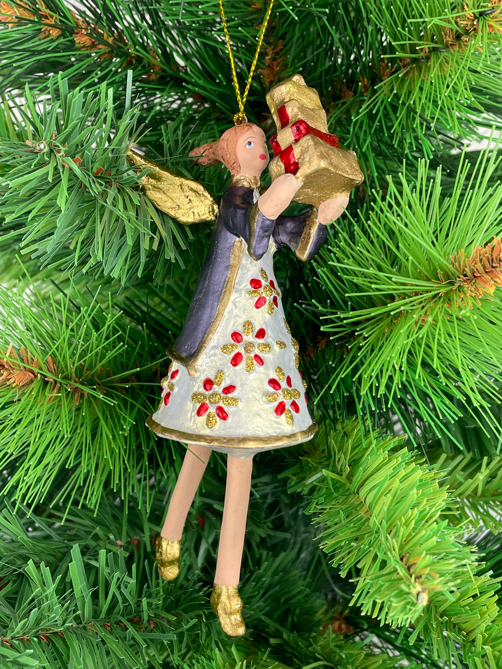 Christbaumschmuck Engel in einem weiß-rot-dunkelblauen Kleid und Geschenken Ornament 15cm hoch