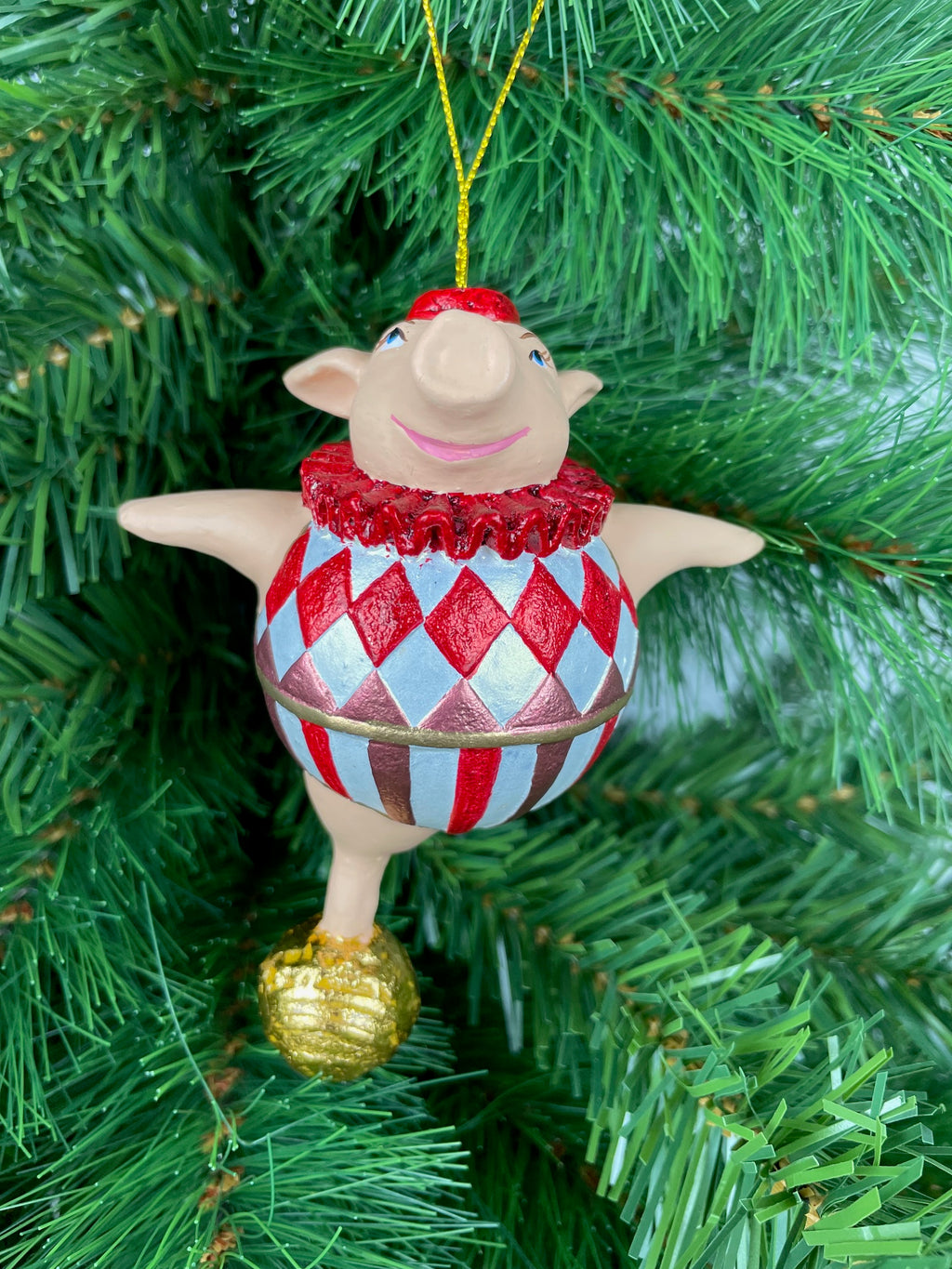 Christbaumschmuck Sportler Schwein auf goldenem Ball in rot-weiß, 12,5 cm hoch und 60g schwer. Dieses wieder verwendbare Ornament aus Kunstharz ist handbemalt und verziert, ideal für den festlichen Einsatz am Weihnachtsbaum. Das Motiv eines sportlichen Schweins passt perfekt zum Thema Zirkus und verleiht Ihrem Weihnachtsbaum eine einzigartige Note. Hängend und gestreift, ist dieses detailreiche Stück von ecosoul eine charmante Ergänzung für die festliche Dekoration zu jeder Jahreszeit.