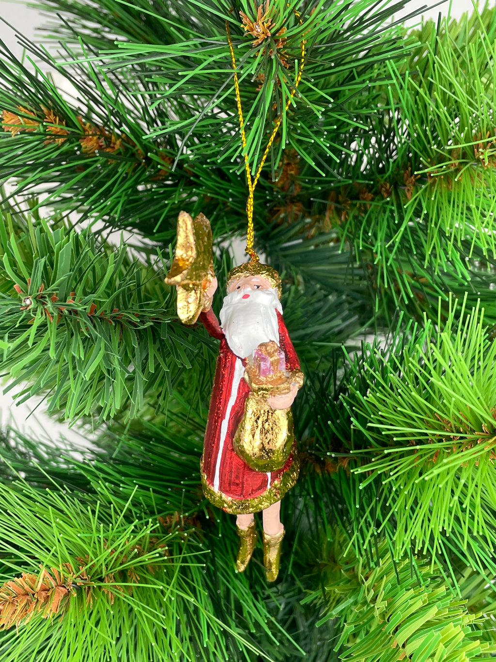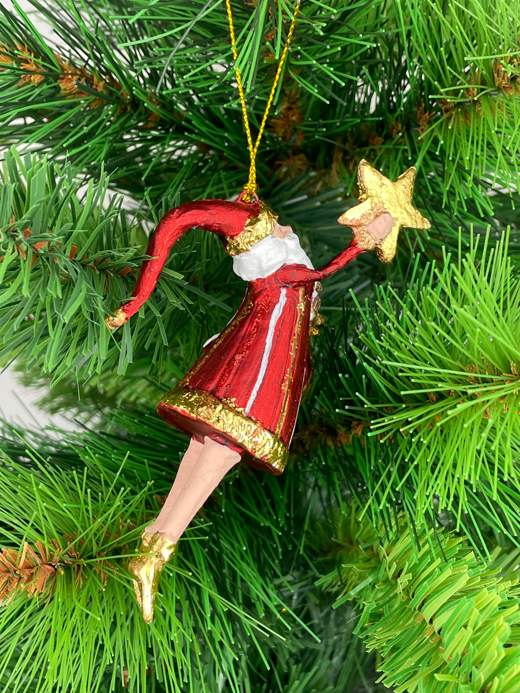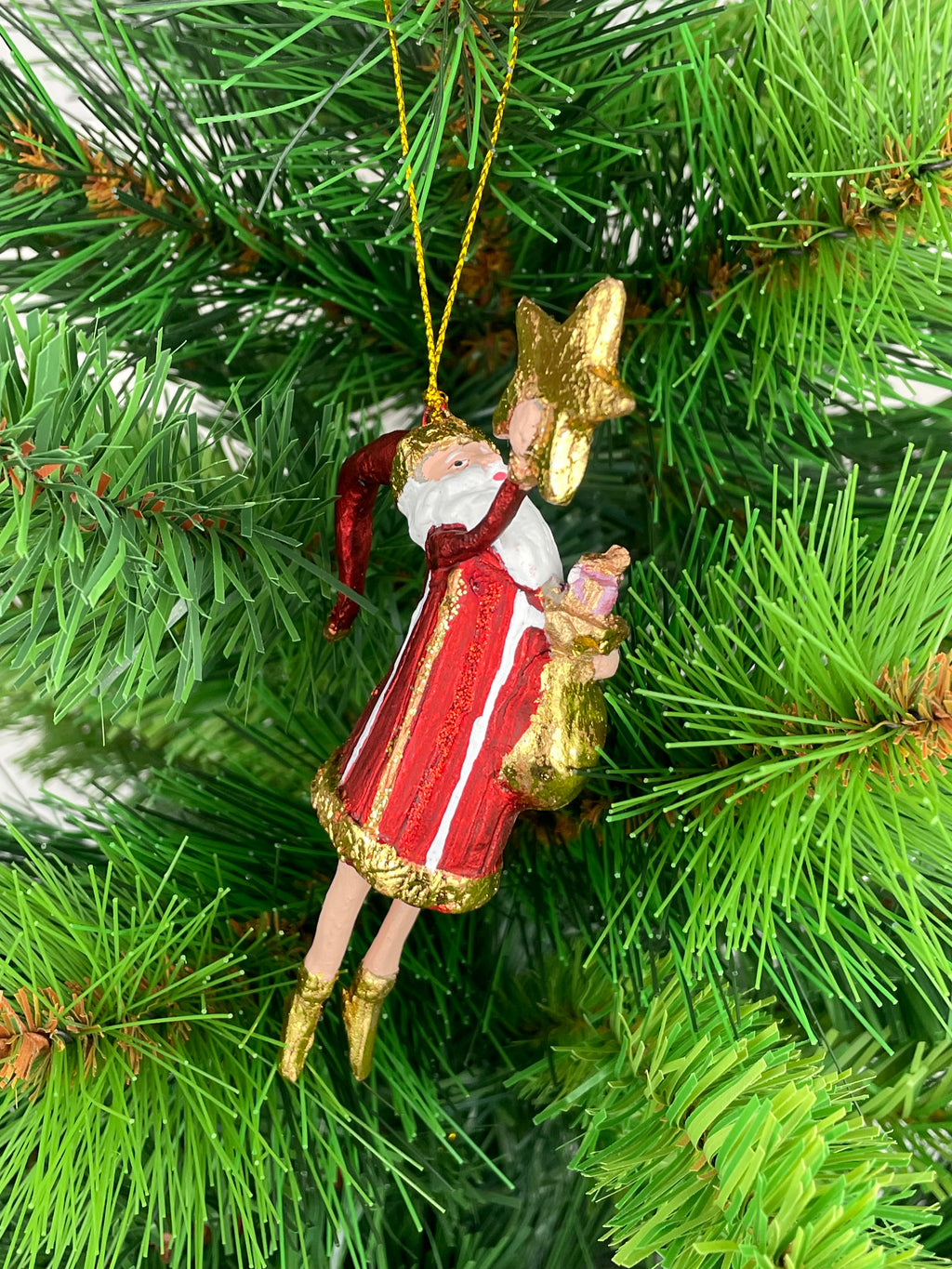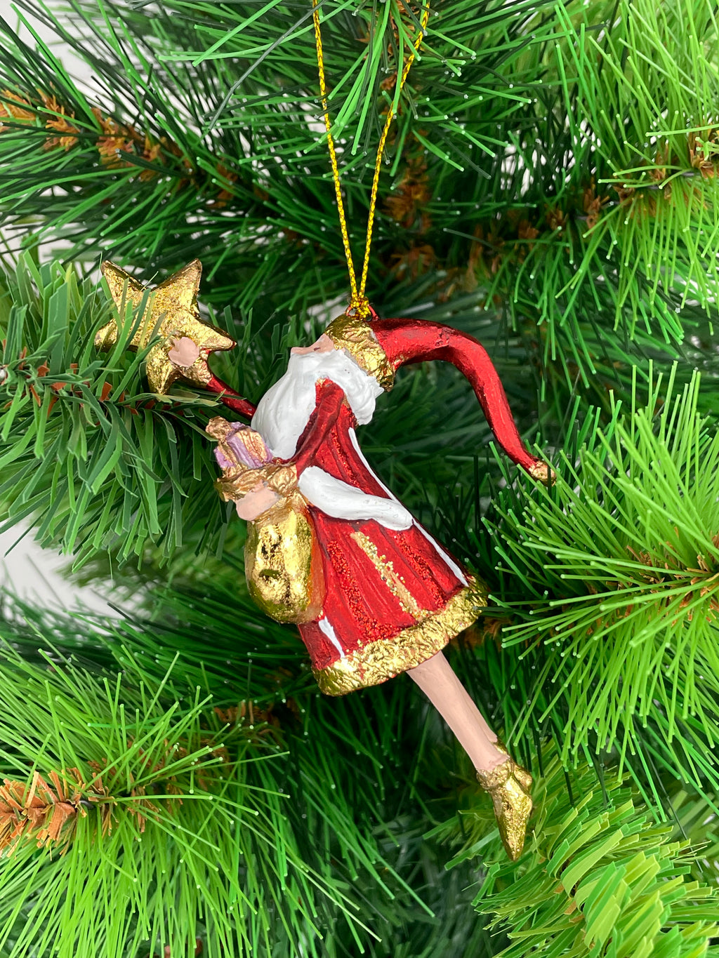 Weihnachtsmann mit rotem Mantel und goldenem Stern und Säckchen 12cm hoch. Dieser moderne Christbaumschmuck aus Kunstharz in rot-goldener Farbe bringt festlichen Glanz in Ihr Zuhause. Hängend montierbar, ist er perfekt für die Weihnachtszeit und verleiht jedem Raum eine weihnachtliche Atmosphäre. Hergestellt in Dänemark, ist dieses Thema-orientierte Stück eine ideale Ergänzung für Ihre jahreszeitliche Dekoration.