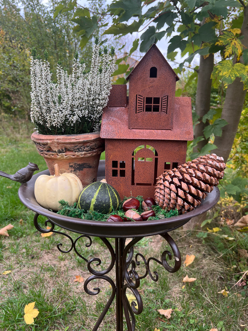 Dieses dekorative Haus/Vogelhaus im Hexenhaus-Design vereint rustikalen Charme mit funktionaler Gartendekoration. Aus robustem Metall gefertigt und mit einer Rost-Optik versehen, kann zugleich als Windlicht dienen und mit Kerzen oder Lichterketten bestückt werden (nicht im Lieferumfang erhalten) und sorgt somit für stimmungsvolle Beleuchtung im Außenbereich. Mit den Maßen 31 cm Höhe, 18 cm Breite und 14 cm Tiefe ist es kompakt genug für vielfältige Platzierungsmöglichkeiten. Ideal für Garten, Terrasse oder Balkon, bietet es eine langlebige und atmosphärische Ergänzung Ihrer Außendekoration.