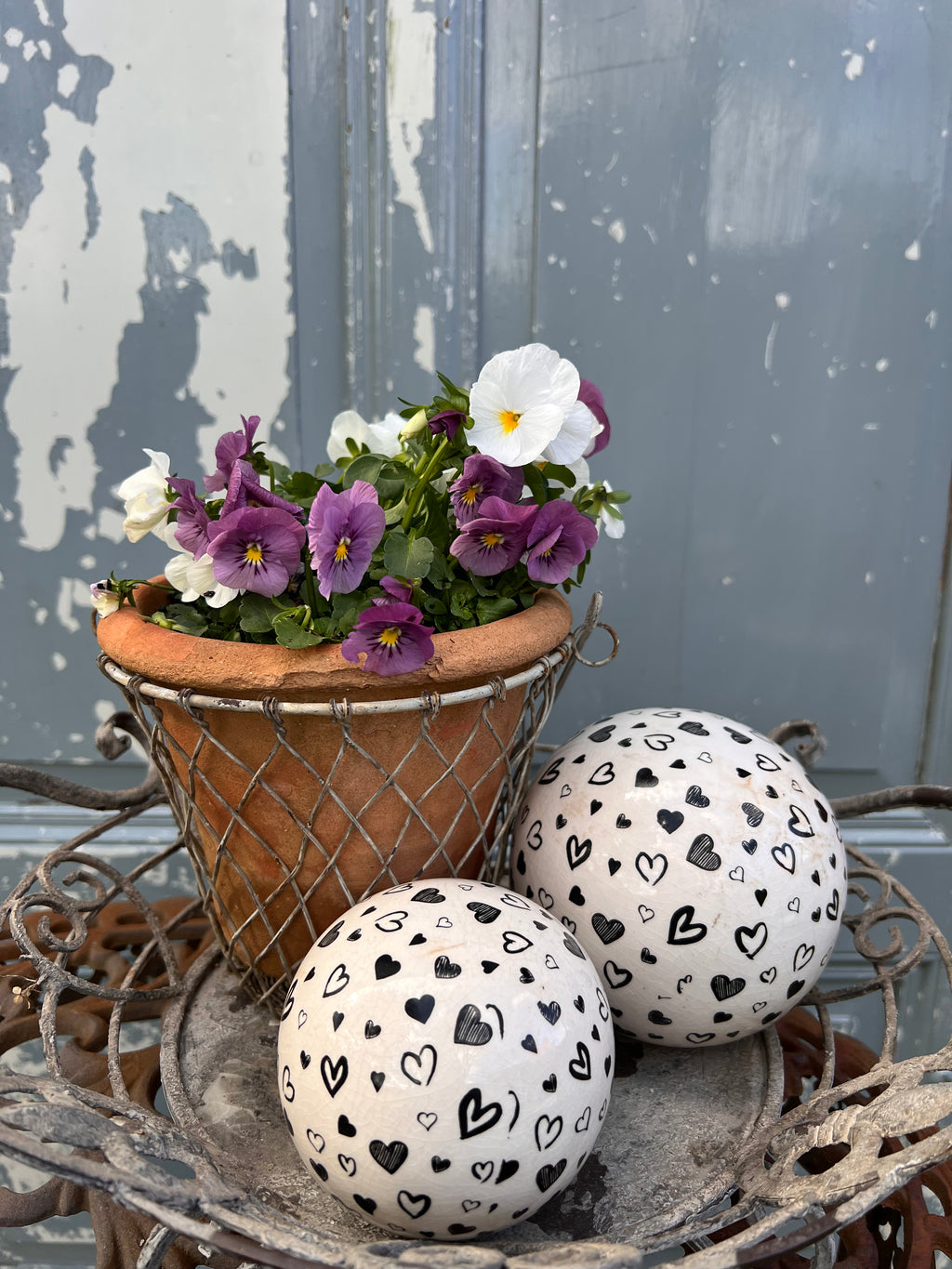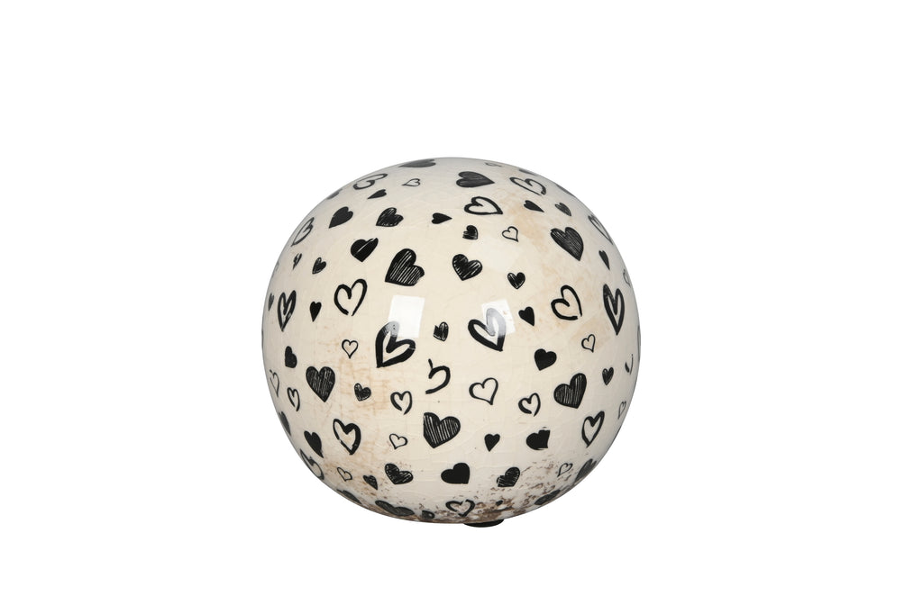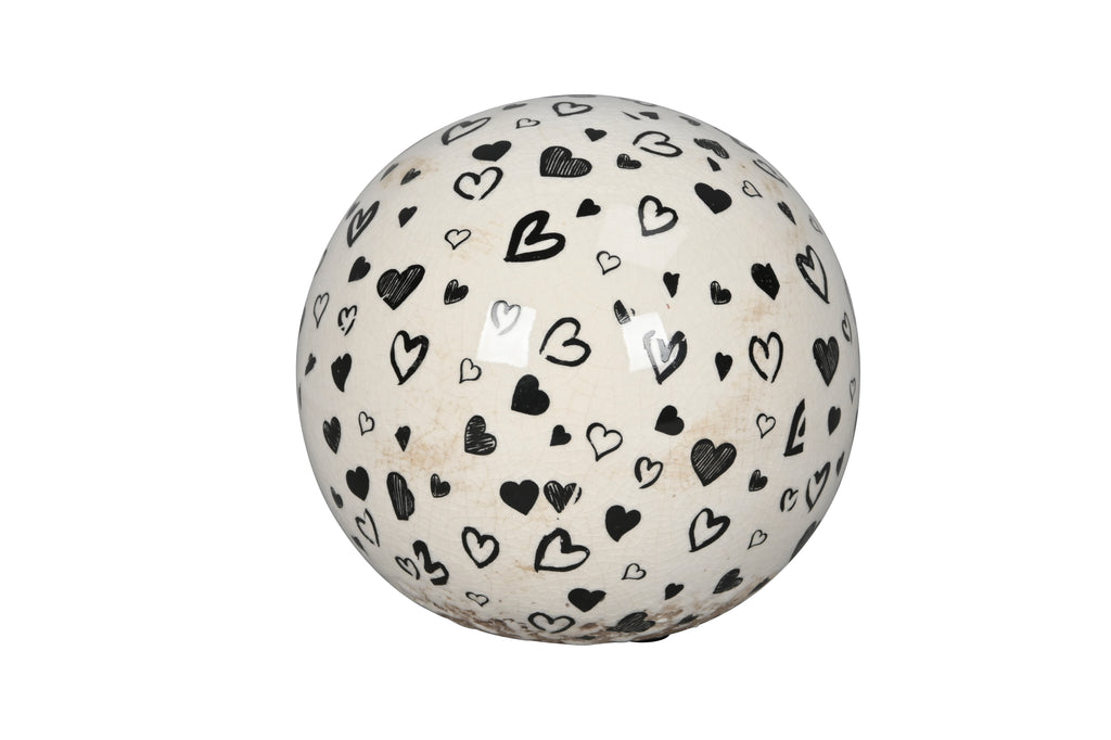 Elegante Keramikkugel im angesagten Shabby-Chic-Stil mit cremefarbenem Grund und zarten schwarzen Herzen. Diese vielseitige Dekokugel verleiht Garten, Balkon oder Wohnraum einen romantischen, vintage-inspirierten Charakter. Die robuste Keramik trotzt Witterungseinflüssen (allerdings bitte vor Frost schützen!) und behält ihre Schönheit über lange Zeit. Wählen Sie zwischen zwei praktischen Größen: 8,5 cm Höhe mit 9 cm Durchmesser oder 11,5 cm Höhe mit 12 cm Durchmesser. Ein zeitloses Accessoire, das Natur und Wohnstil harmonisch verbindet.