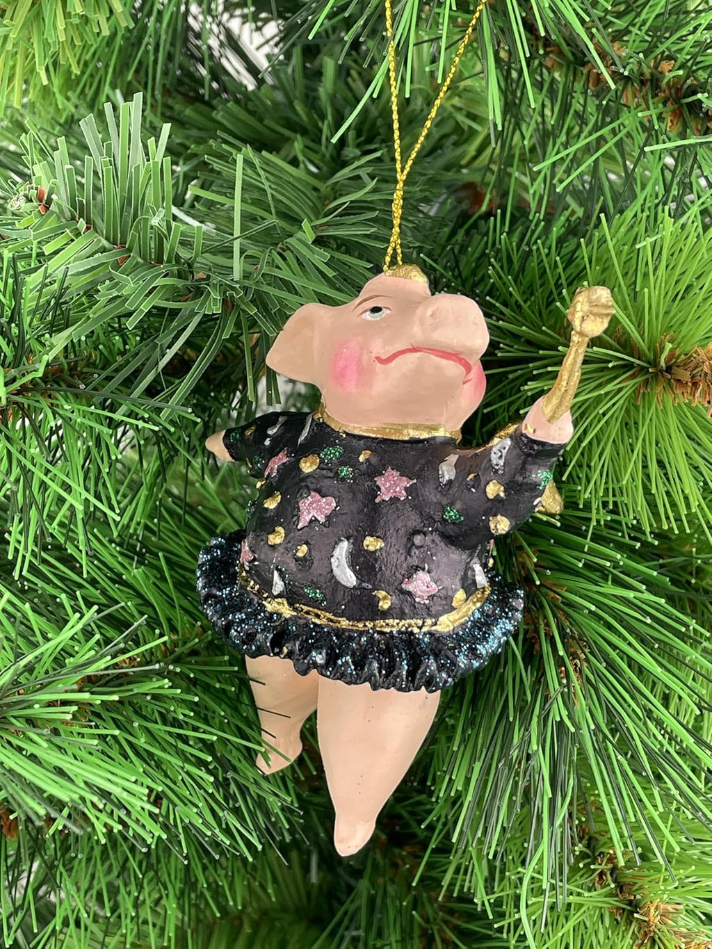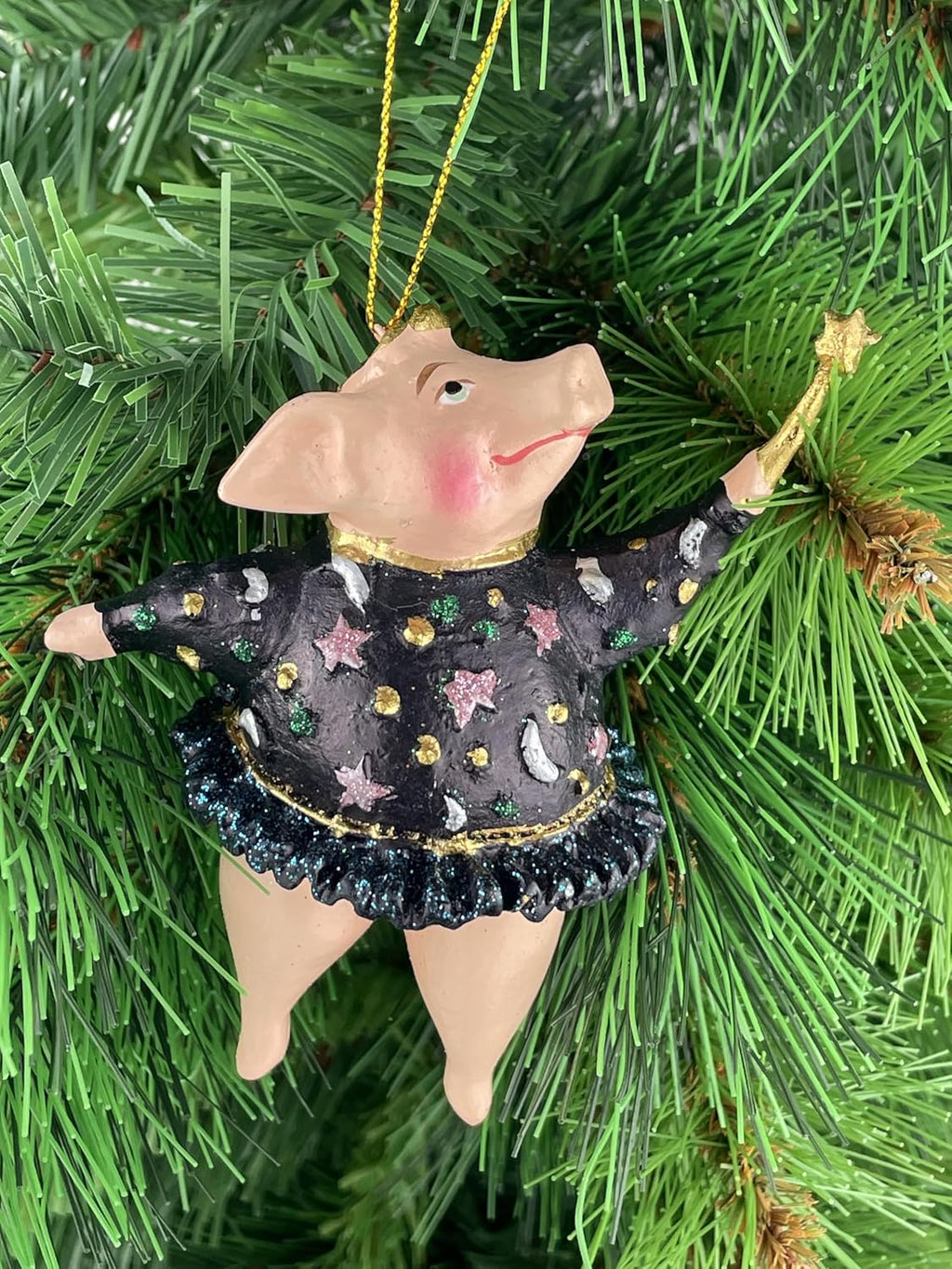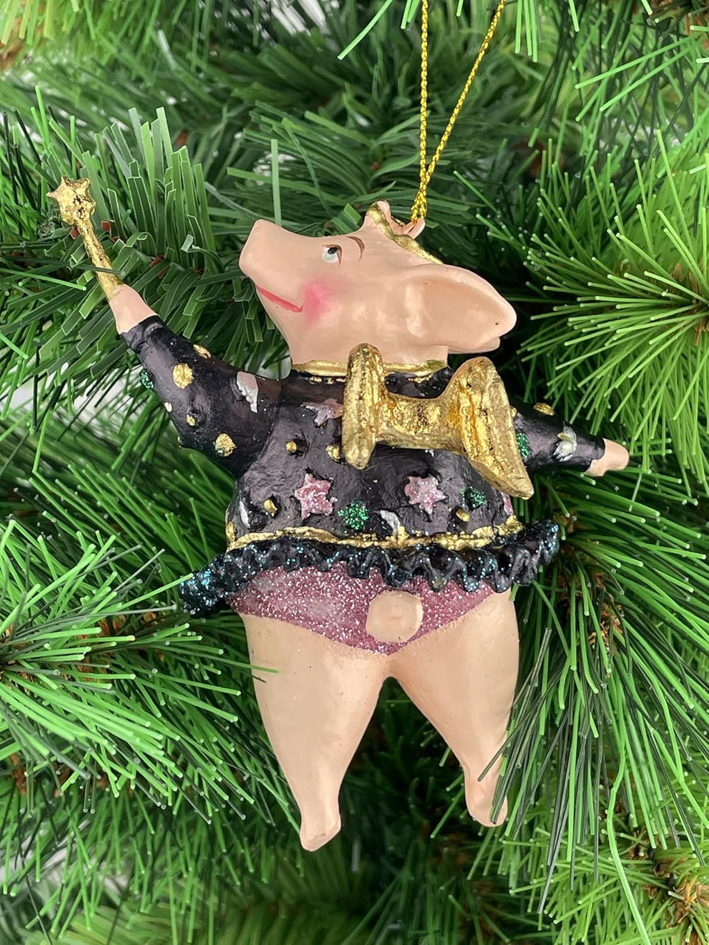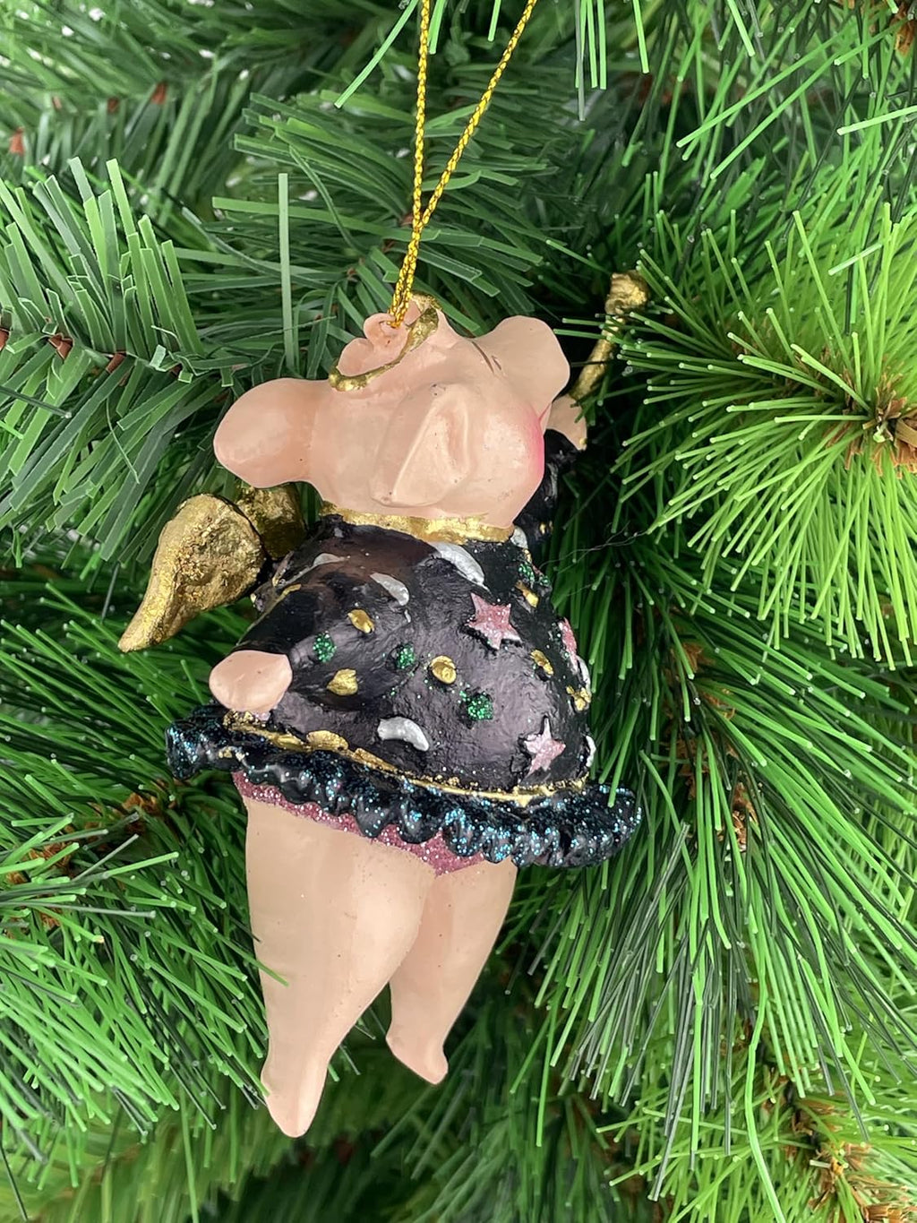 Bringen Sie festlichen Charme an Ihren Weihnachtsbaum mit diesem bezaubernden Christbaumschmuck in Form eines fliegenden Schweinchens. Diese handgefertigte Figur aus Kunstharz zeigt ein niedliches Schwein mit goldenen Flügeln, einem schwarzen Kleid mit lila Akzenten und einem goldenen Stern auf einem Stab. Der 12 cm große Hänger ist mit feinen Details verziert und hat eine goldene Aufhängeschnur für einfaches Anbringen am Baum. Teil einer Kollektion von ausgefallenen Weihnachtsdekorationen, die Ihrem Fest einen verspielten und einzigartigen Touch verleihen. Das Schweinchen mit Flügeln symbolisiert Glück und Freude zur Weihnachtszeit. Aufgrund seiner zerbrechlichen Natur empfehlen wir vorsichtige Handhabung beim Auf- und Abhängen. Ein wunderbares Geschenk für Sammler von besonderen Weihnachtsschmuckstücken oder als besonderer Blickfang für Ihren eigenen Festtagsbaum.