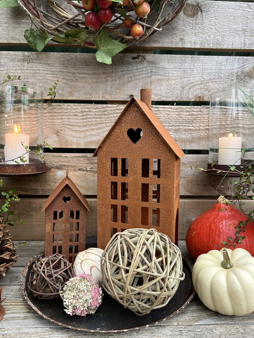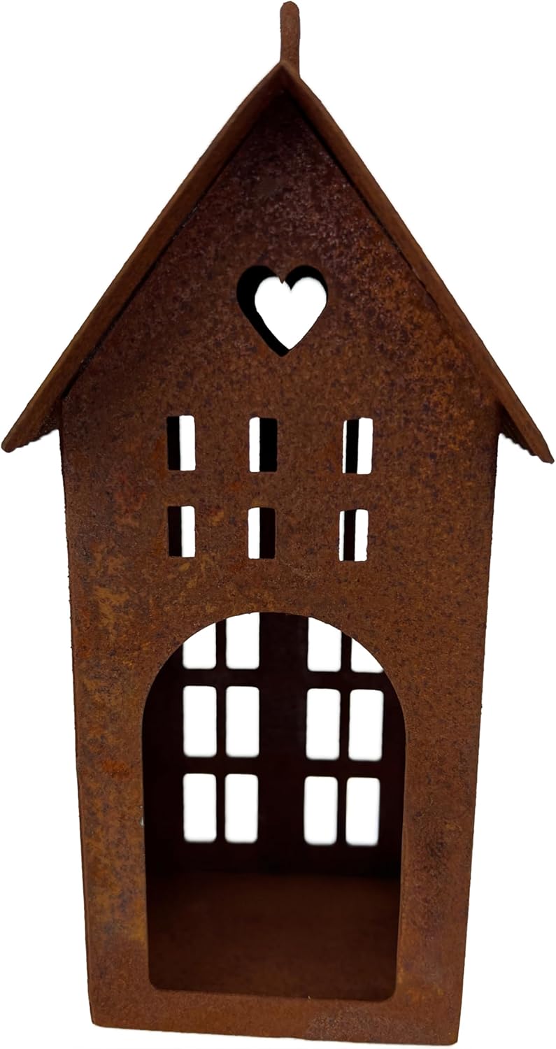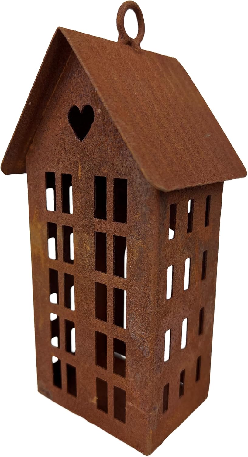 Verleihen Sie Ihrem Garten eine bezaubernde Atmosphäre mit diesem rustikalen Windlicht-Häuschen. Das 17 cm hohe Dekorationshaus aus Metall besticht durch sein charaktervolles Design mit mehreren Fenstern und einem charmanten Herzmotiv im Giebel. Die natürliche Rostoptik verleiht dem Stück eine vintage Patina und macht es zu einem zeitlosen Blickfang. Ausgestattet mit einem praktischen Ring zum Aufhängen, können Sie das Häuschen vielseitig platzieren. Die ausgeschnittenen Fenster erzeugen bei Kerzenschein ein stimmungsvolles Lichtspiel und tauchen Ihren Außenbereich in warmes, einladendes Licht. Ein wunderschönes Accessoire für Garten, Terrasse oder Balkon, das sowohl als Windlicht als auch als dekorative Skulptur überzeugt. Die robuste Metallkonstruktion garantiert eine langlebige Verwendung im Außenbereich.
