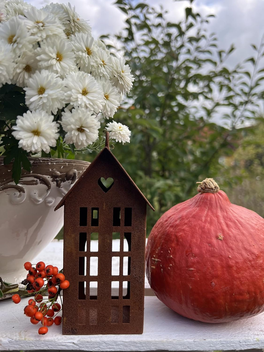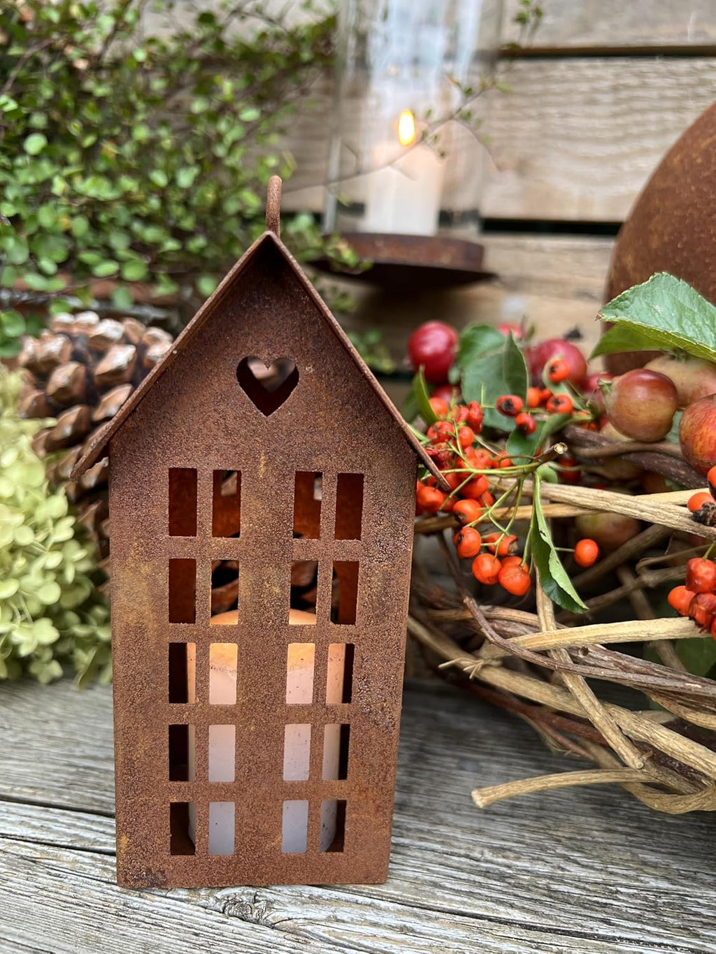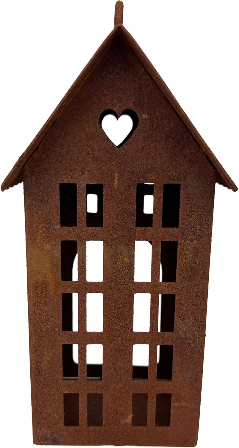 Verleihen Sie Ihrem Garten eine bezaubernde Atmosphäre mit diesem rustikalen Windlicht-Häuschen. Das 17 cm hohe Dekorationshaus aus Metall besticht durch sein charaktervolles Design mit mehreren Fenstern und einem charmanten Herzmotiv im Giebel. Die natürliche Rostoptik verleiht dem Stück eine vintage Patina und macht es zu einem zeitlosen Blickfang. Ausgestattet mit einem praktischen Ring zum Aufhängen, können Sie das Häuschen vielseitig platzieren. Die ausgeschnittenen Fenster erzeugen bei Kerzenschein ein stimmungsvolles Lichtspiel und tauchen Ihren Außenbereich in warmes, einladendes Licht. Ein wunderschönes Accessoire für Garten, Terrasse oder Balkon, das sowohl als Windlicht als auch als dekorative Skulptur überzeugt. Die robuste Metallkonstruktion garantiert eine langlebige Verwendung im Außenbereich.
