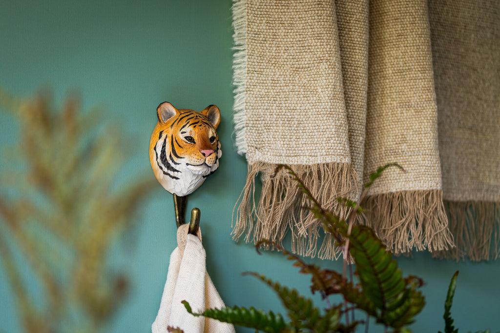 KLEIDERHAKEN TIGER Garderobe Wandhaken massiv Landhaus Vintage handgeschnitzt und handbemalt Holz und Metall-Haken 11cm hoch