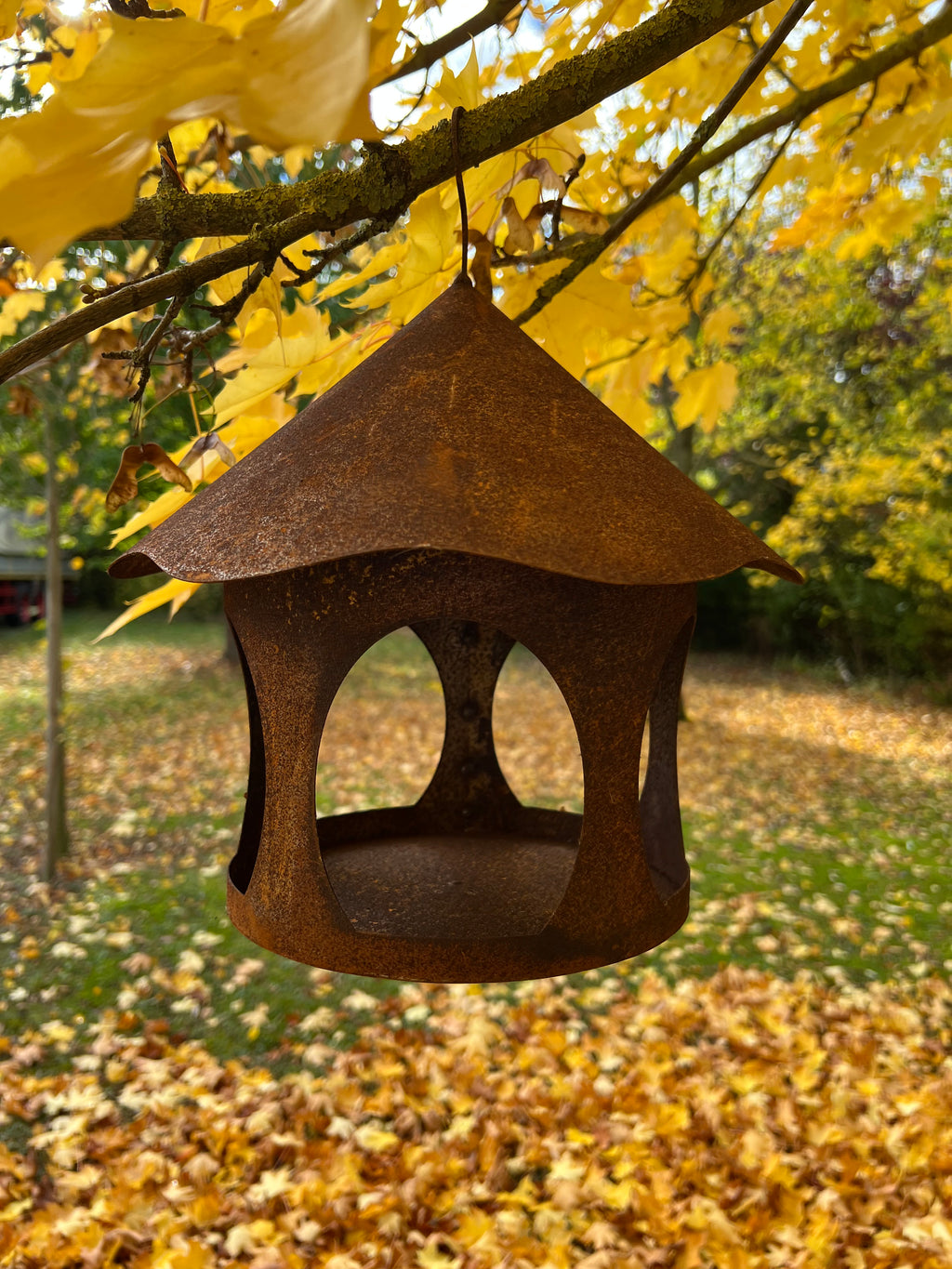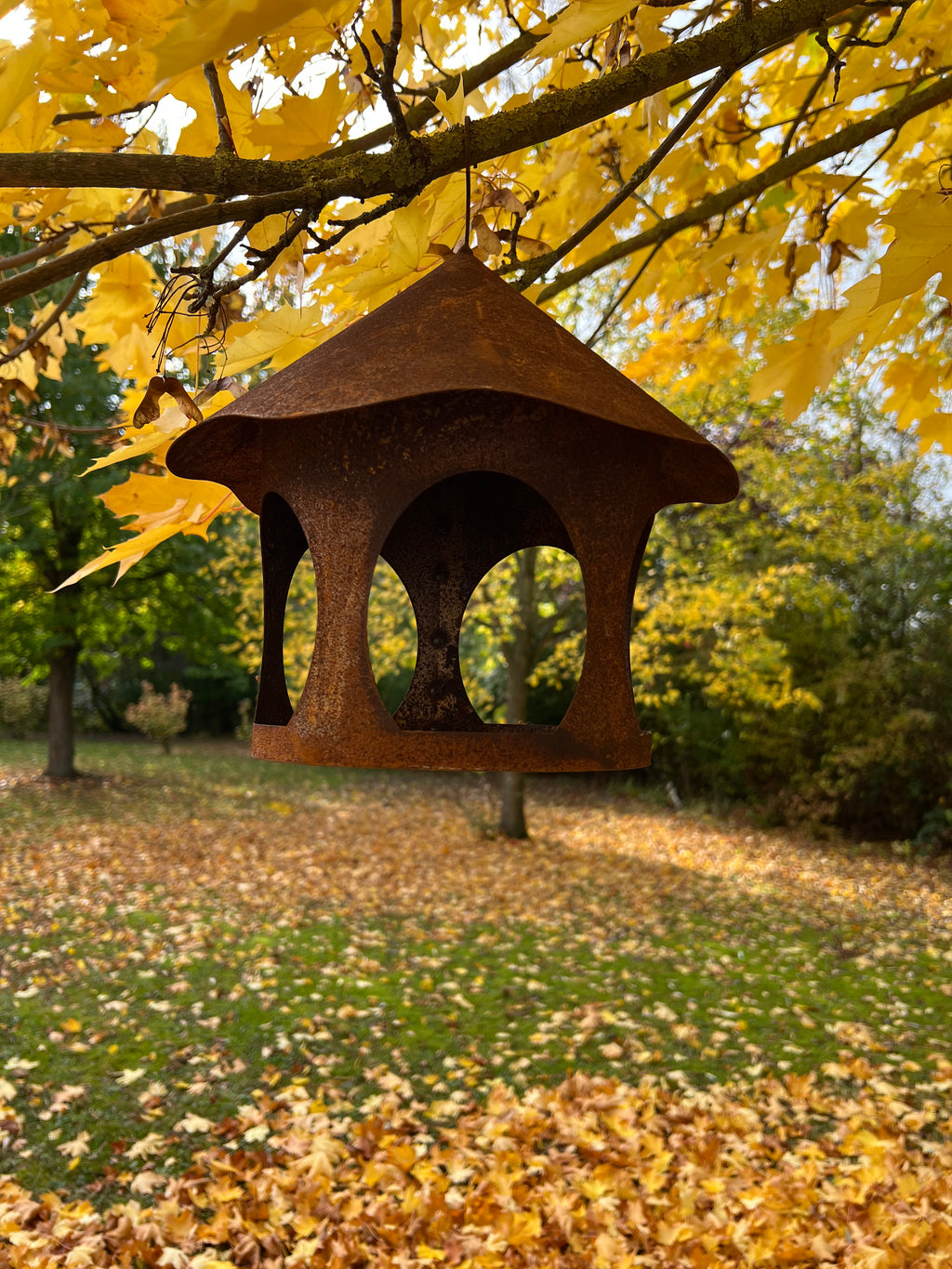Gartendeko Vogelhaus, Futterstation für Wildvögel und Gartenvögel aus Metall mit Edelrost  28cm Durchmesser, mit Haken zum Aufhängen