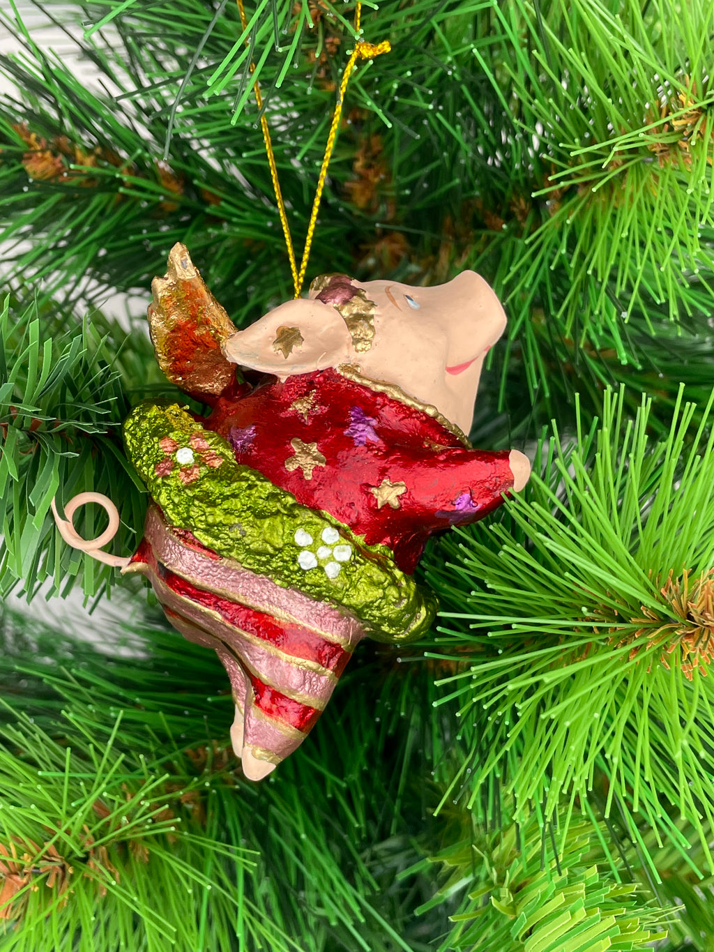 Der Christbaumschmuck Ballerina Schwein mit Flügeln in rot und grün ist eine bezaubernde Dekoration für die Weihnachtszeit. Die handbemalte Figur aus Kunstharz ist wieder verwendbar und kann am Weihnachtsbaum aufgehängt werden. Mit einer Höhe von 8,5cm und einem Gewicht von 45g ist dieses Medium-Größe Ornament von der Marke ecosoul ein einzigartiger Blickfang für jeden festlich geschmückten Baum.