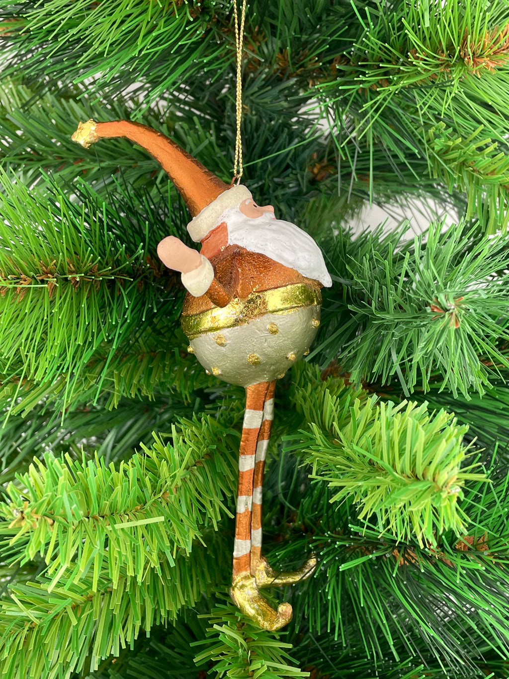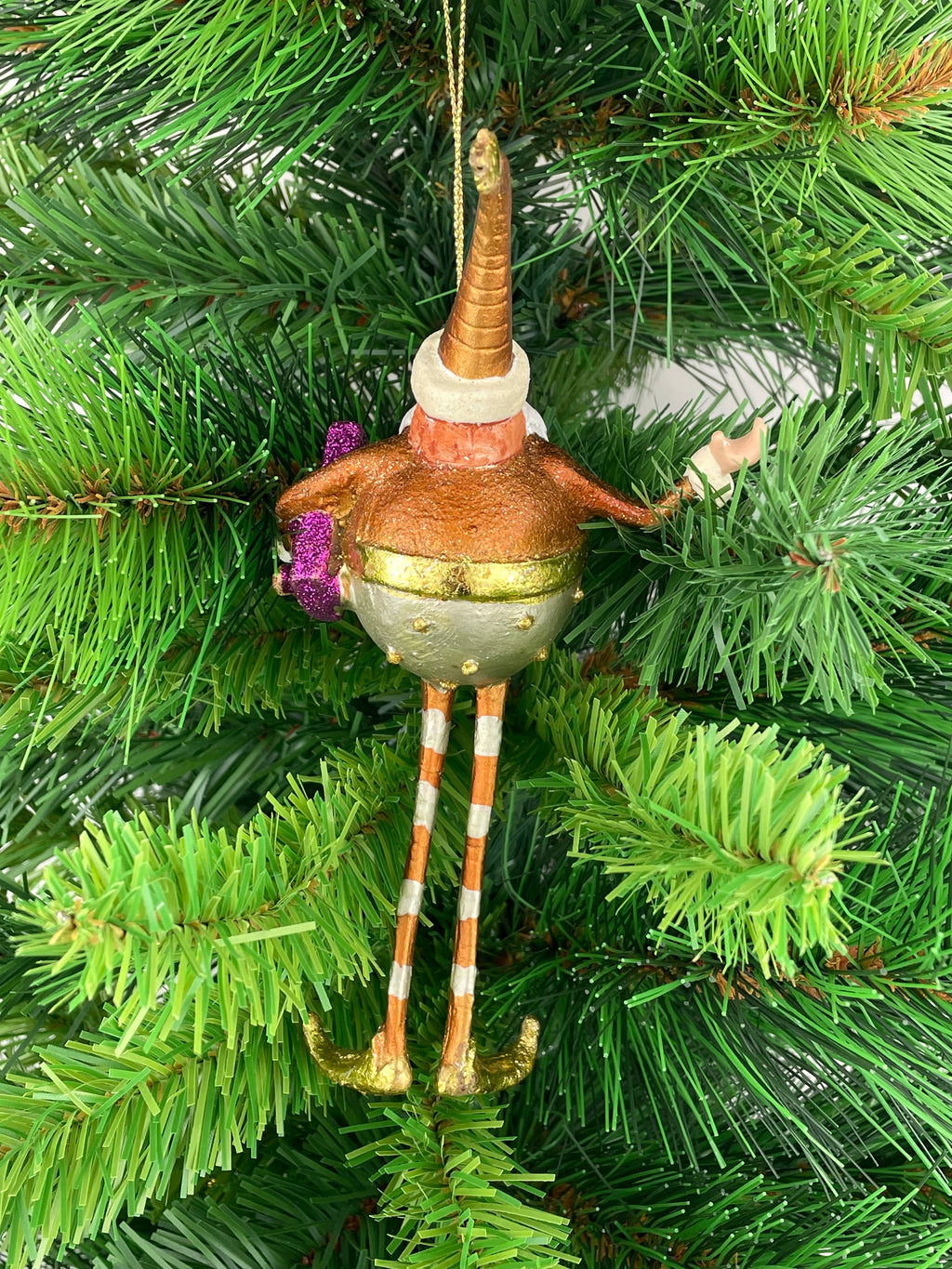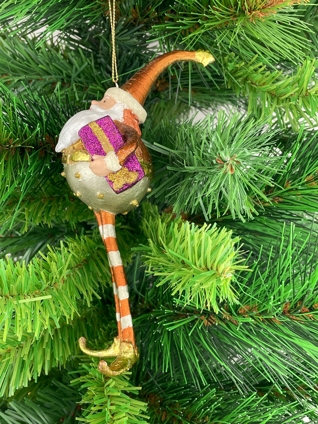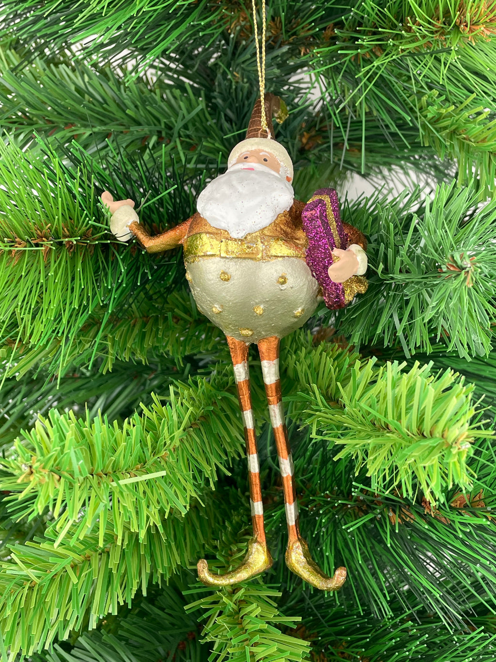 Der Christbaumschmuck Weihnachtsmann Gabenträger in Silber-Gold-Kupfer mit einem lila Geschenk ist eine wunderschöne Dekoration für die Weihnachtszeit. Das Ornament aus Kunstharz ist 18 cm groß und zeigt einen detailreich verzierten Weihnachtsmann mit langen Beinen, der ein Geschenk trägt. Mit seinem metallischen Glanz und den streifenartigen Mustern wird dieser Anhänger sicherlich zum Blickfang an jedem Weihnachtsbaum. Perfekt für Weihnachtsliebhaber und Sammler von festlichem Schmuck, wurde dieses liebevoll gestaltete Stück in Dänemark hergestellt. Es ist wieder verwendbar und kann jedes Jahr aufs Neue für festliche Stimmung sorgen. Ein Must-Have für die Weihnachtsdekoration und ein tolles Geschenk für die Feiertage.