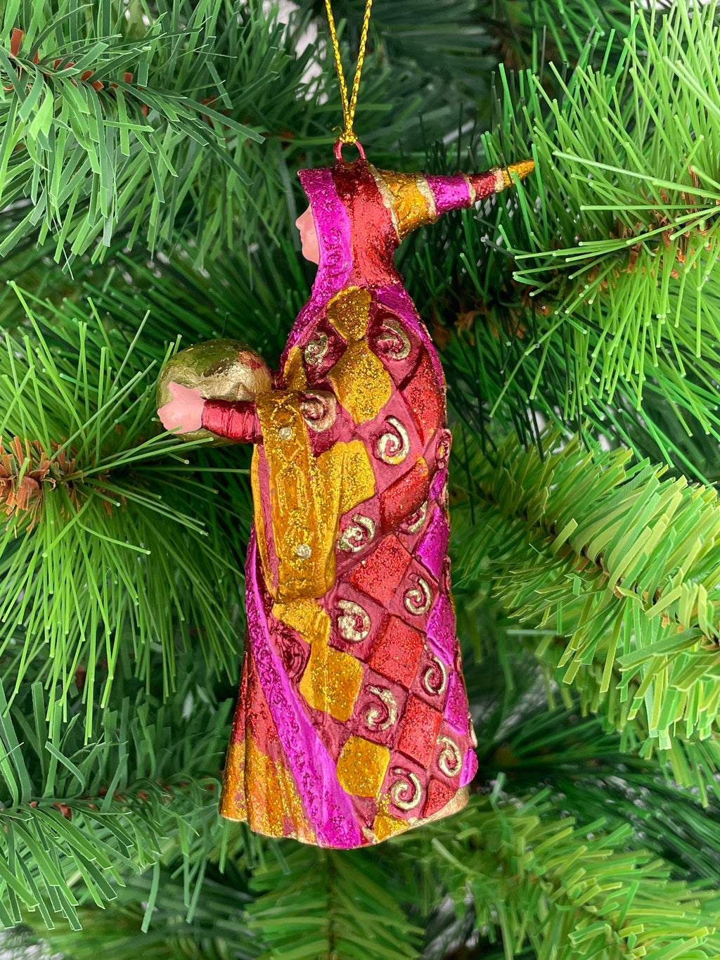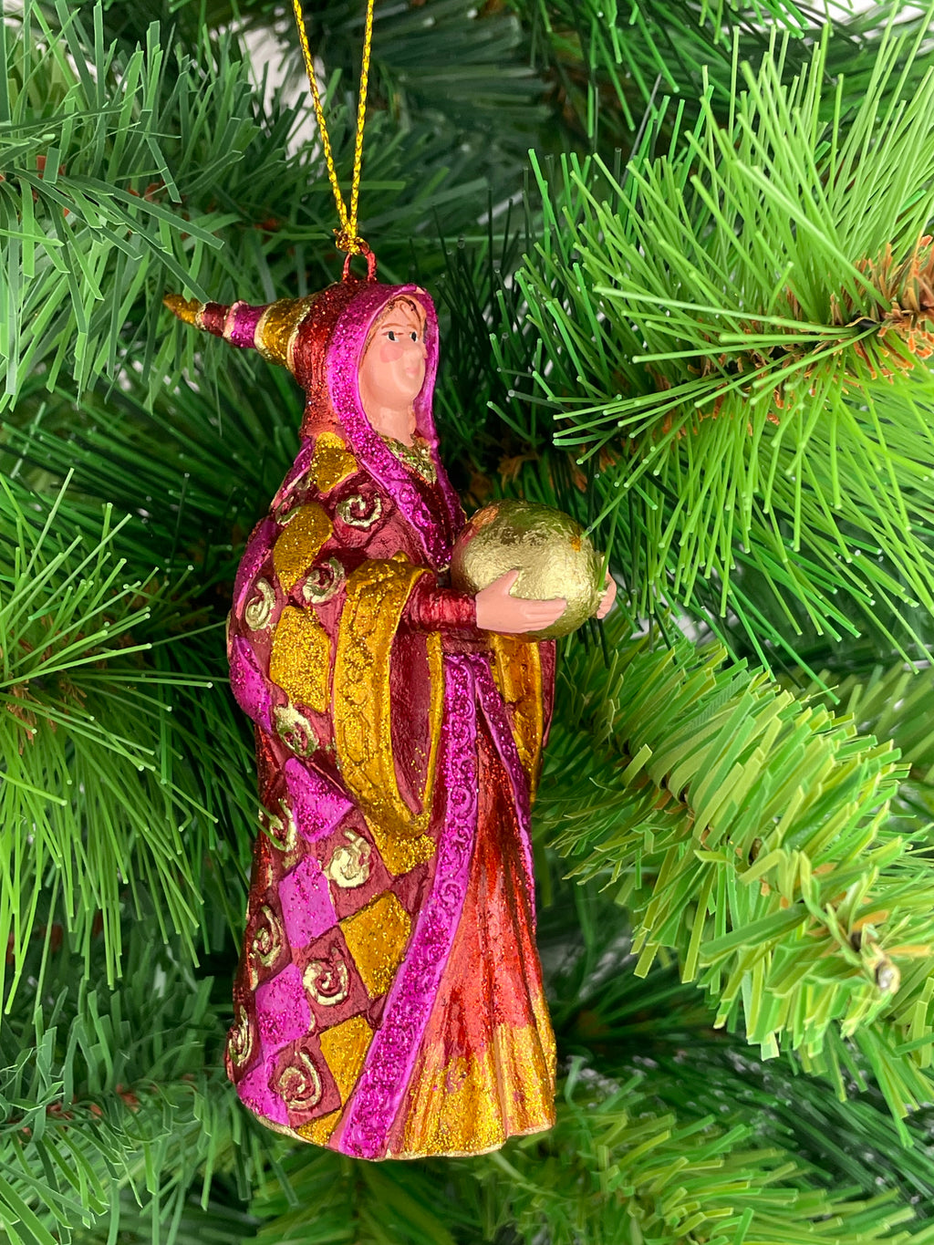 Baumschmuck Zauberin in einem langen rot-goldenen Mantel und einer goldenen Kugel in 12cm Höhe ist ein wunderschönes Ornament für die Weihnachtszeit. Die Zauberin aus Kunstharz ist detailreich verziert und hängt elegant an jedem Christbaum. Mit ihrem metallischen Glanz und den funkelnden Akzenten in rot, gold und pink bringt sie eine zauberhafte Atmosphäre in jedes Zuhause. Perfekt geeignet für Liebhaber von Weihnachtsdekorationen mit einem Hauch von Magie und Mystik.