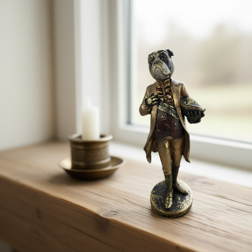 Diese elegante Bulldoggen-Dekofigur verleiht Ihrem Zuhause einen Hauch von Luxus. Mit ihrer charaktervollen Gestaltung in Schwarz und Gold wirkt sie als stilvolles Accessoire auf Kaminsimsen, Anrichten oder Regalen. Die robuste Verarbeitung mit stabilem Sockel garantiert sicheren Stand und lange Freude an diesem dekorativen Kunstobjekt. Mit einer Höhe von 31 cm prägt die Figur jeden Raum diskret, ohne zu dominieren – perfekt für Liebhaber von hochwertiger Wohnausstattung und Hundefreunde gleichermaßen.