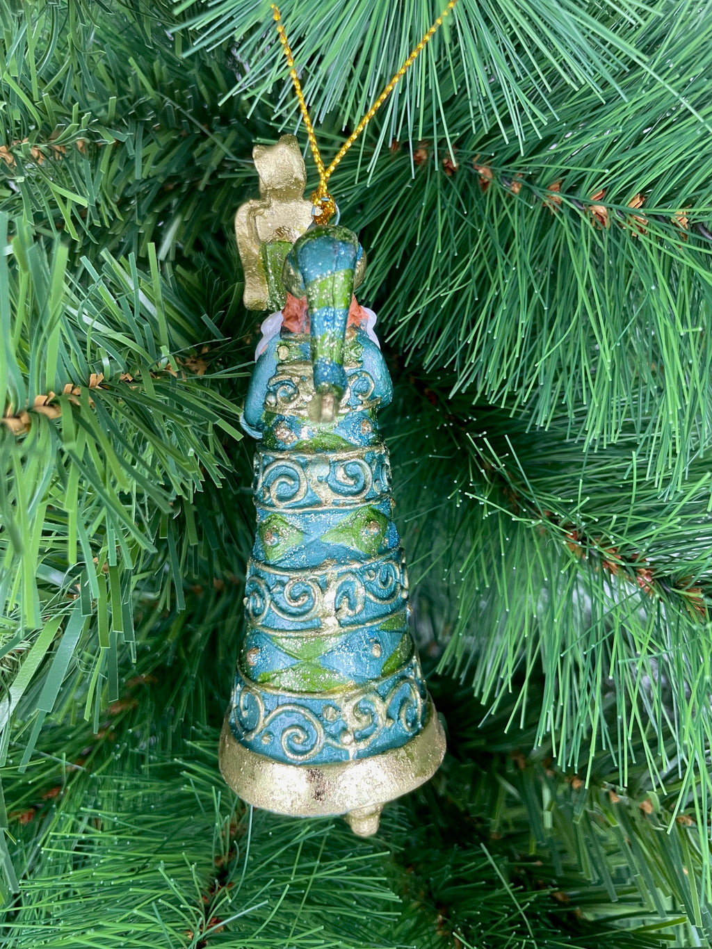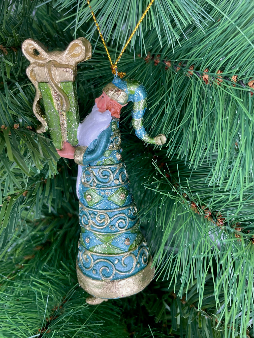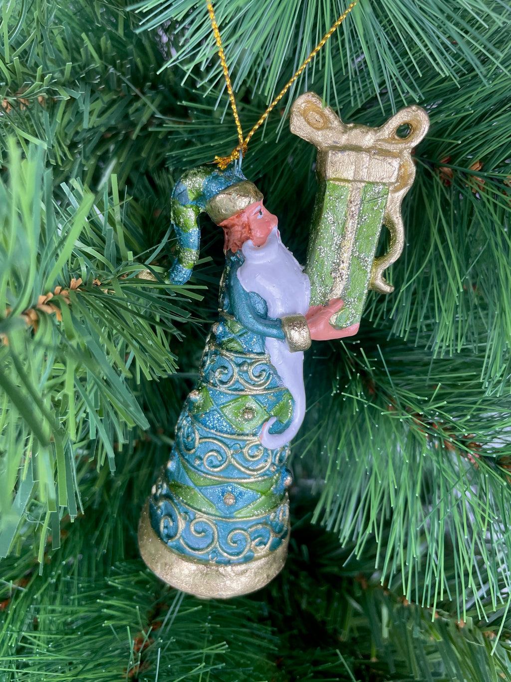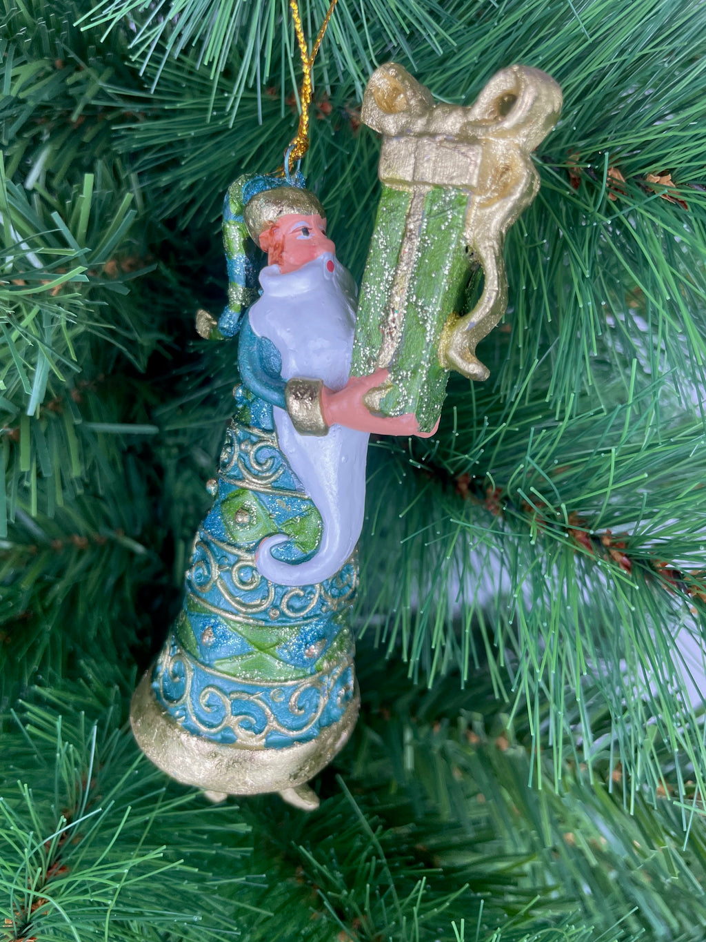 Christbaumschmuck: Weihnachtsmann in einem gold-türkisfarbenen Mantel und einem Geschenk, perfekt für die Weihnachtszeit. Die 14cm hohe Figur ist wiederverwendbar, hängend und metallisch verziert, ideal für die festliche Dekoration. Hergestellt aus Kunstharz in einer türkis-goldenen Farbkombination mit rankenartigem Muster, von der Marke ecosoul. Passend für jeden Weihnachtsbaum und eine schöne Ergänzung für das festliche Zuhause.