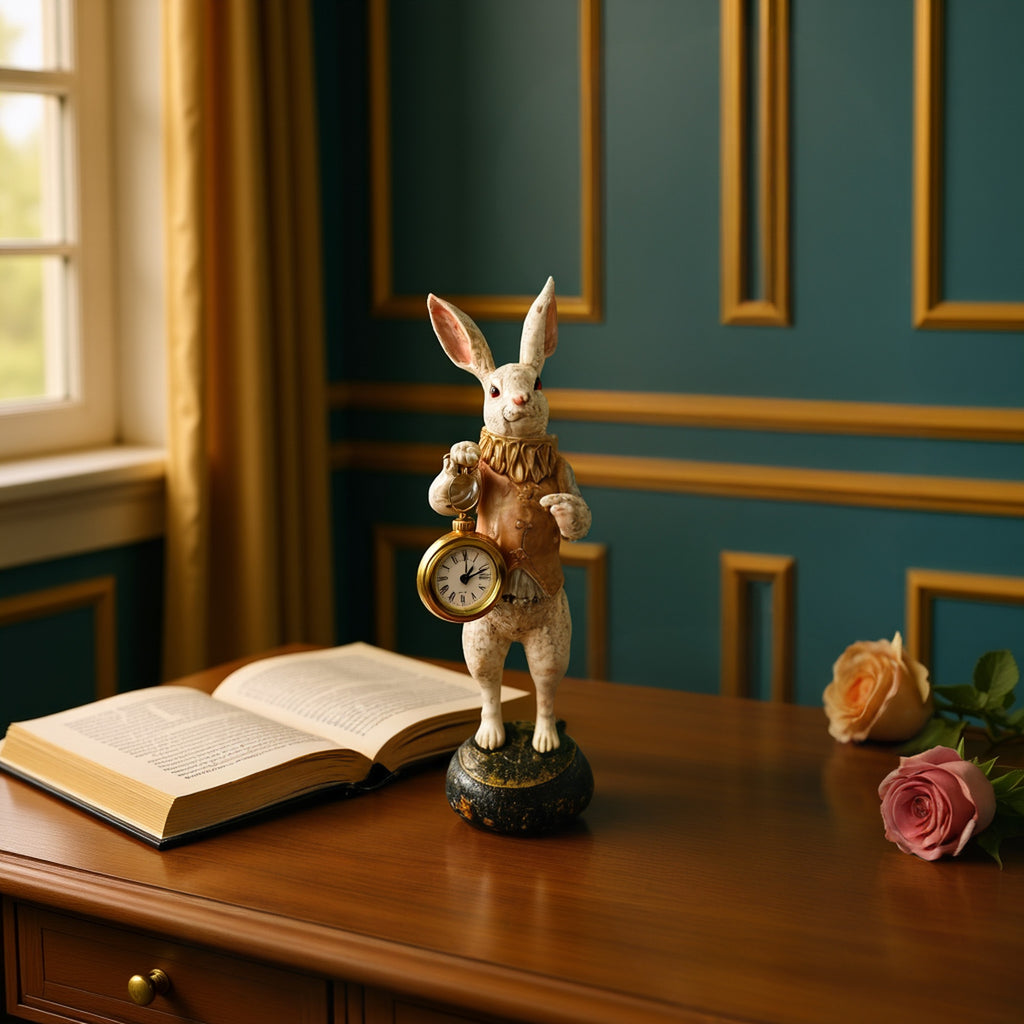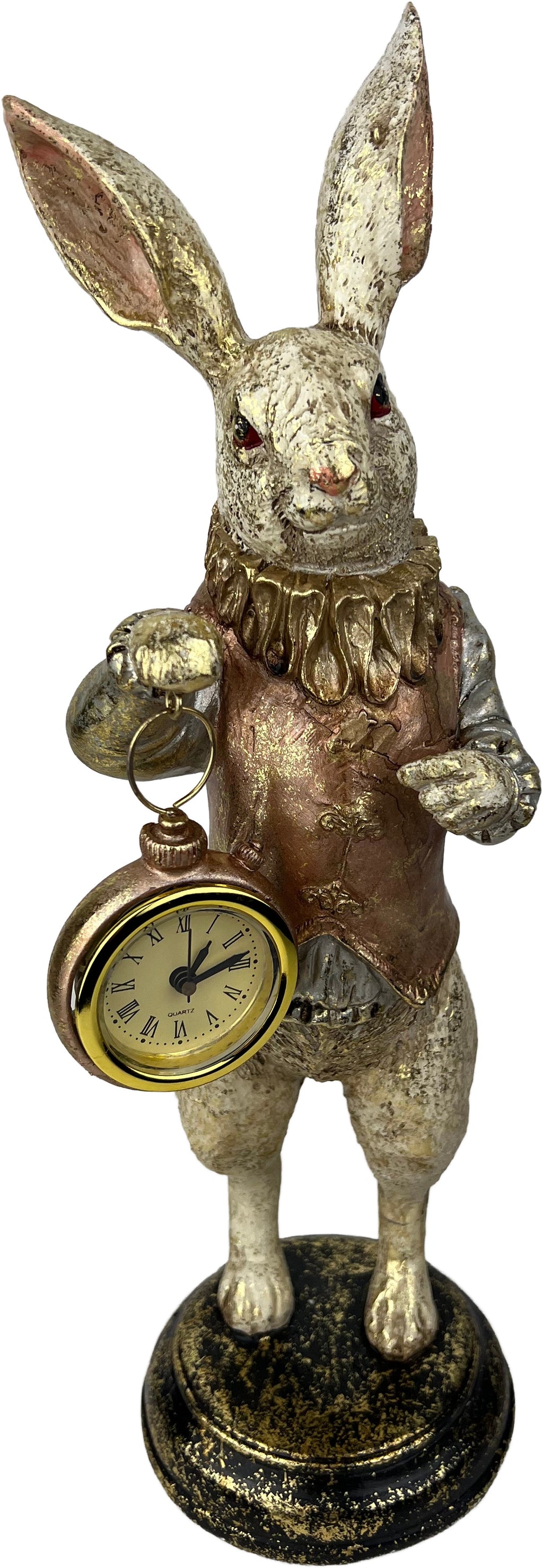 Diese elegante Standuhr in Form eines Hasen mit Uhr ist ein exquisiter Blickfang für jeden Landhausstil. Die statuettenhafte Skulptur misst 34,5 cm in der Höhe und besticht durch feine Details sowie eine dezente gold-beige Farbgebung. Die 5 cm große Uhr wird durch eine separat erhältliche Batterie betrieben. Ideal als dekoratives Geschenk vereint sie zeitlose Schönheit und Funktionalität für Wohnzimmer oder Kaminbereich.