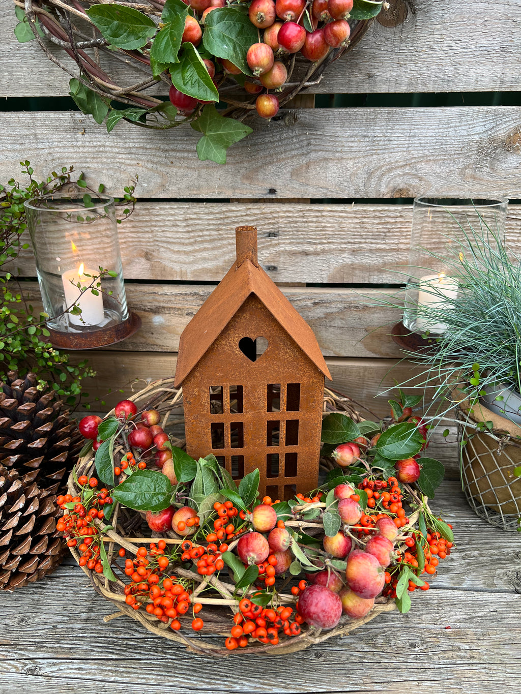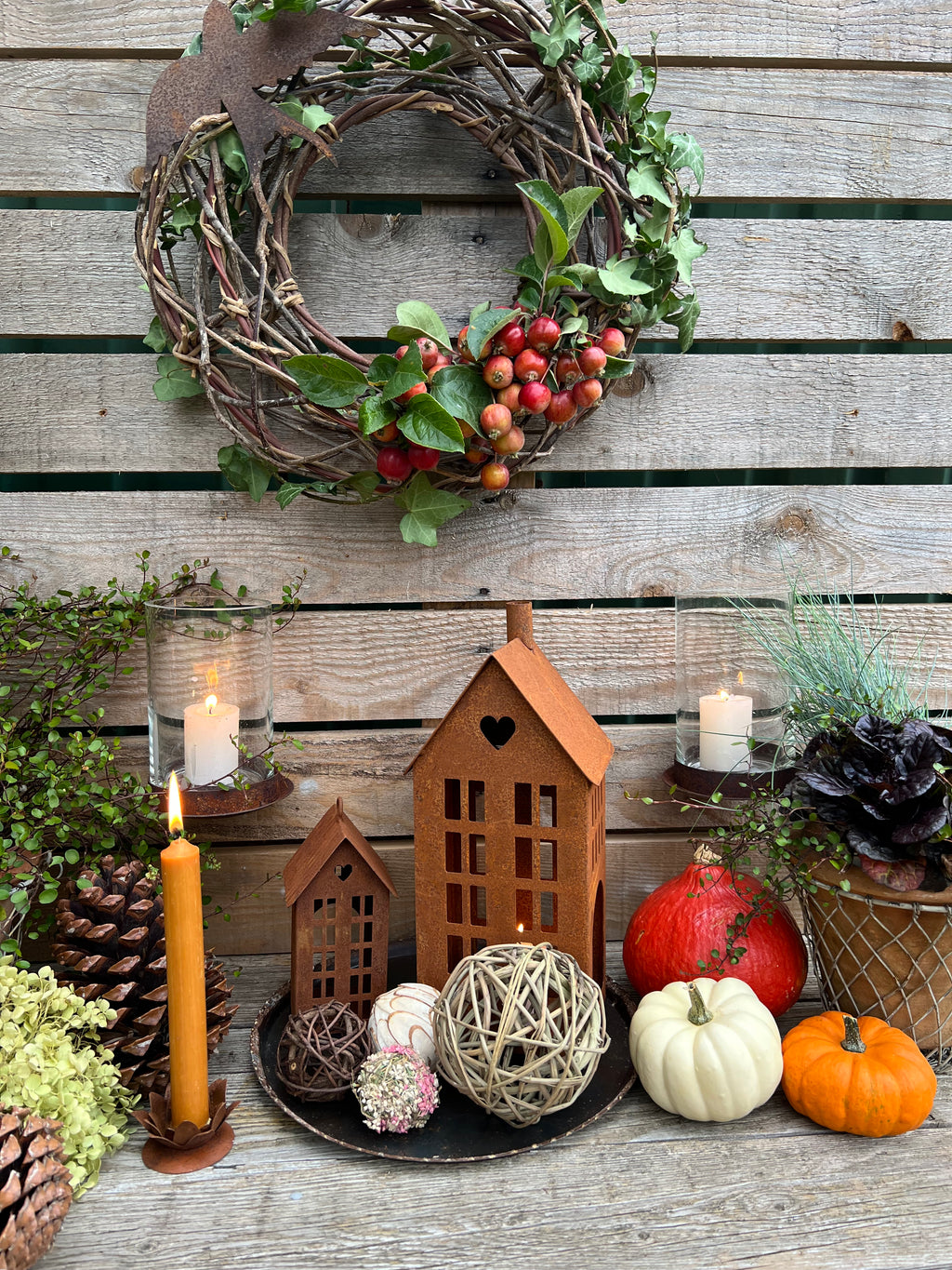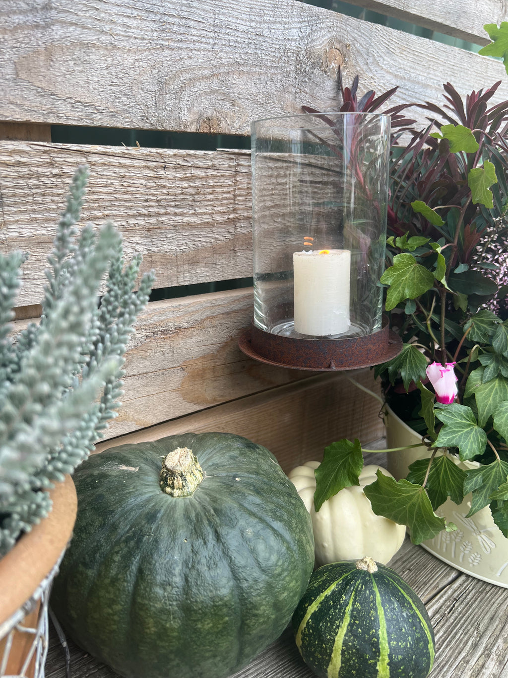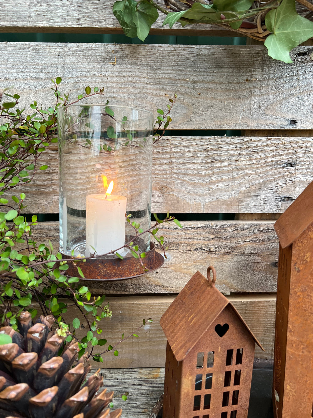 Dieser Kerzenhalter ist speziell dafür konzipiert, sicher an einer Holzwand oder einem Baumstamm befestigt zu werden. Aus robustem Metall mit einer seitlichen Schraube bietet er festen Halt. Der Rost-Look verleiht ihm eine natürliche, rustikale Optik, während der integrierte Glas-Einsatz das Kerzenlicht schützt und für eine gleichmäßige Flamme sorgt. Mit einer Höhe von 15 cm und einem Durchmesser von 9 cm ist er ideal für Teelichter oder Stumpenkerzen und schafft eine stimmungsvolle Atmosphäre im Außenbereich oder an natürlichen Oberflächen.