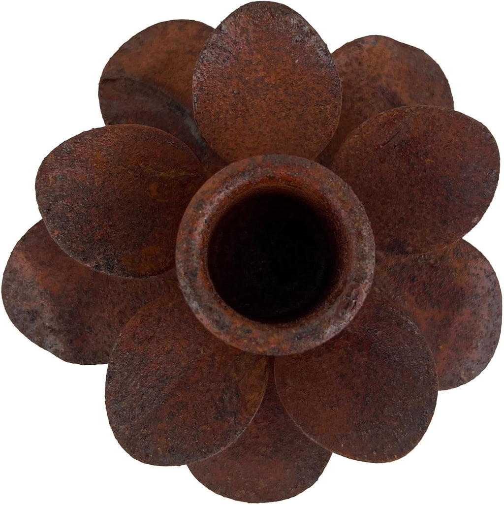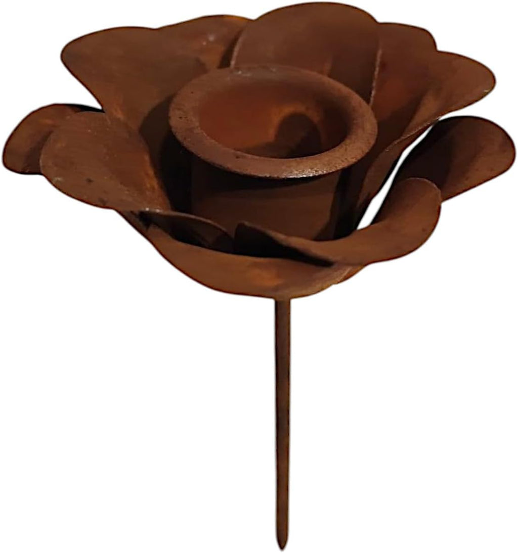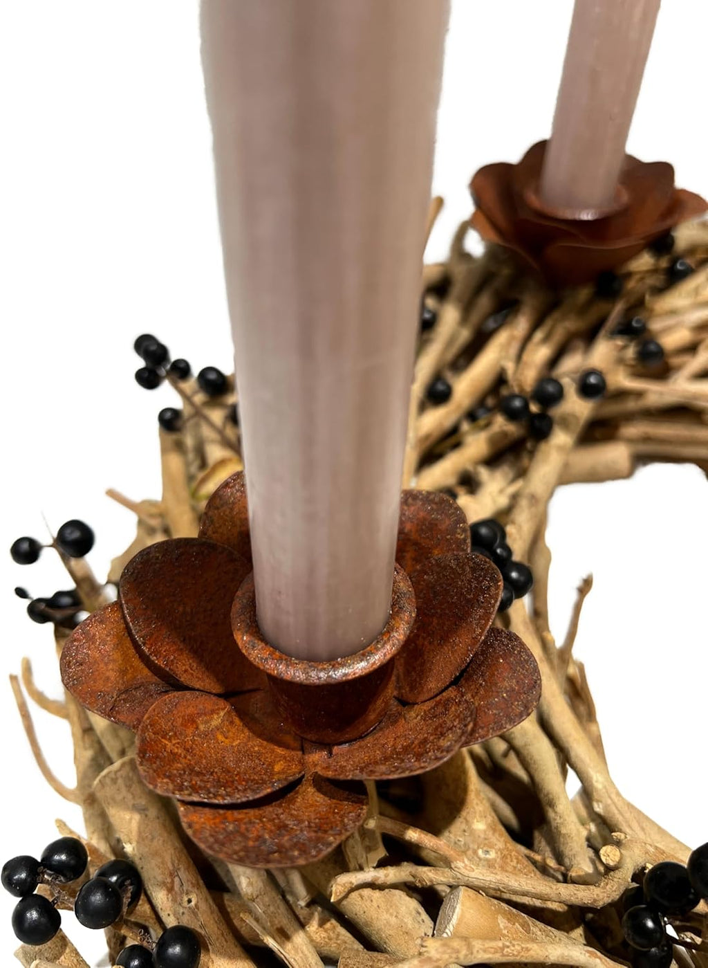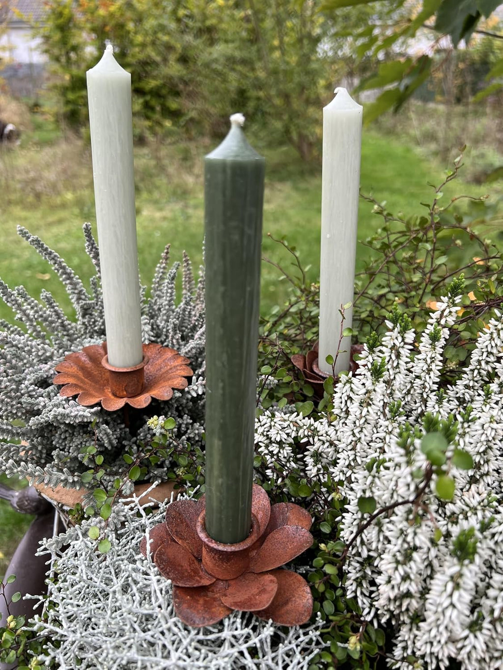Dieser kunstvolle Kerzenhalter in Blütenform verleiht Ihrer Adventsdekoration eine besondere Note. Die filigrane Metallkonstruktion ist in zwei Ausführungen erhältlich: elegant schwarz lackiert oder mit charakteristischer Rostoptik, die jedem Arrangement eine rustikale, zeitlose Atmosphäre verleiht. Der Halter ist speziell für Stabkerzen konzipiert und lässt sich dank des integrierten Stabs mühelos in Adventskränze oder andere Dekorationen einstecken. Die blütenartige Gestaltung mit mehreren geschwungenen Metallblättern sorgt für einen stilvollen Lichteffekt und bietet gleichzeitig sicheren Halt für die Kerze. Ein vielseitiges Dekoelement, das sich perfekt für die Advents- und Weihnachtszeit eignet und Ihrem Kranz oder Gesteck einen besonderen Akzent verleiht. Die robuste Metallausführung garantiert eine langlebige Verwendung und macht den Kerzenhalter zu einem zeitlosen Begleiter für die festliche Jahreszeit.