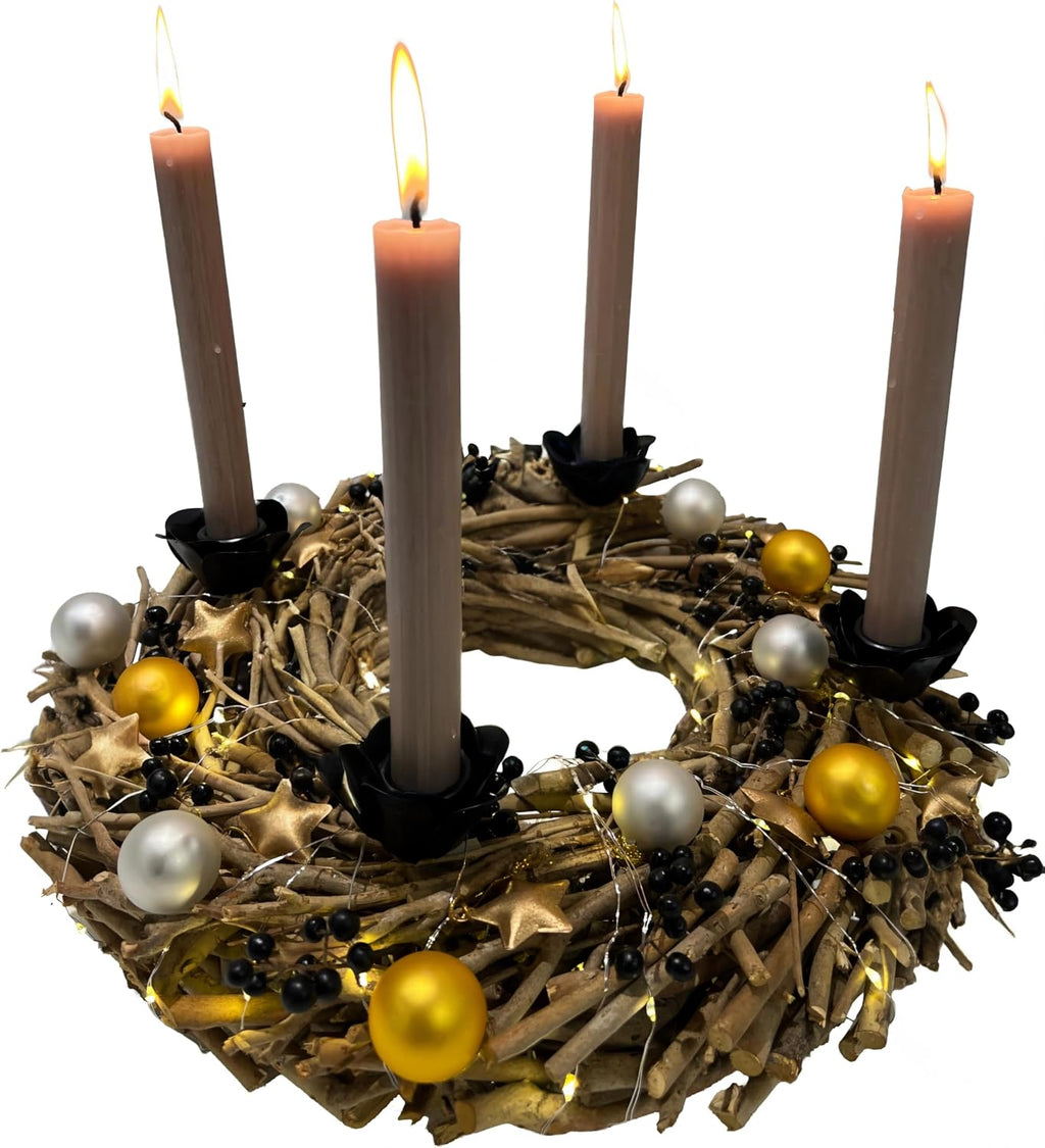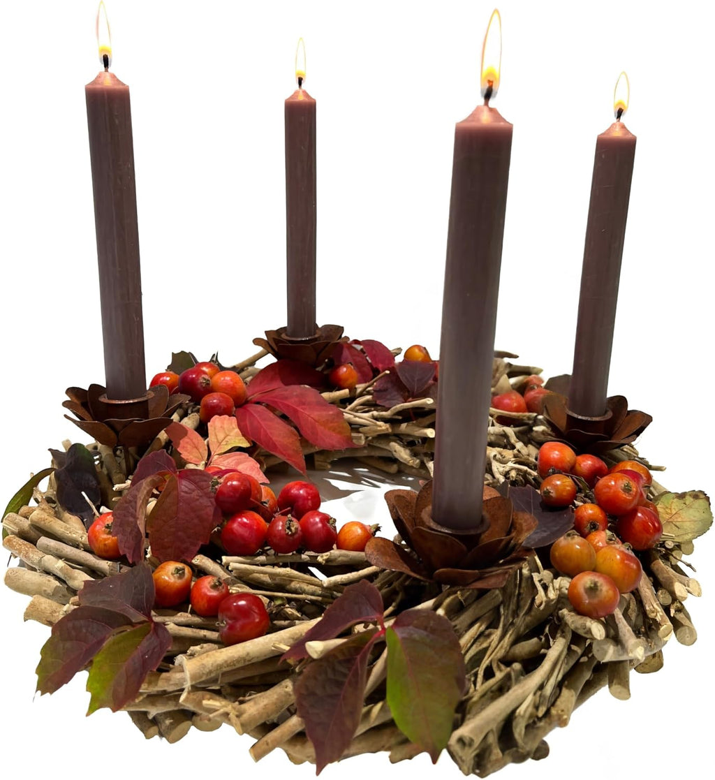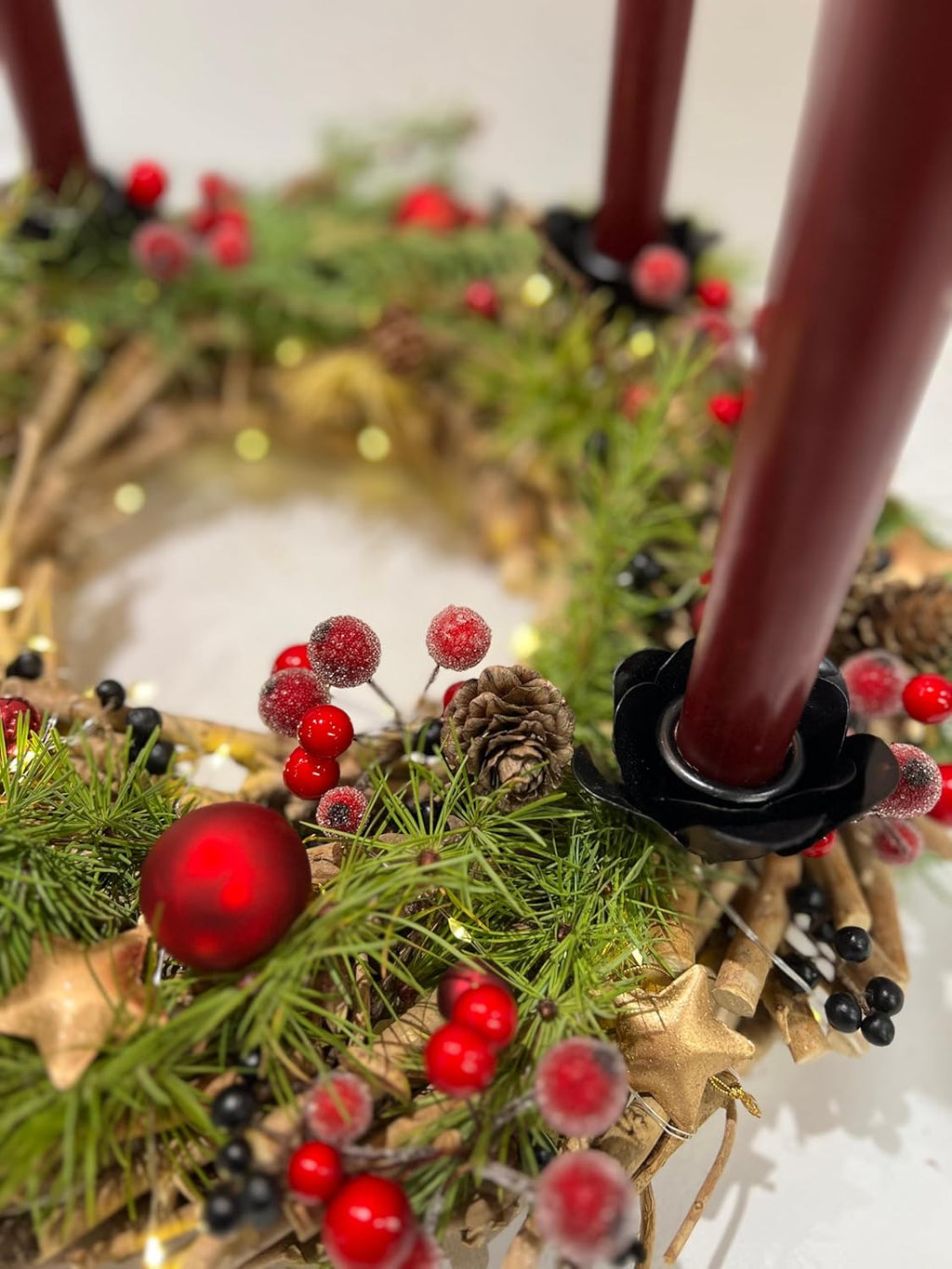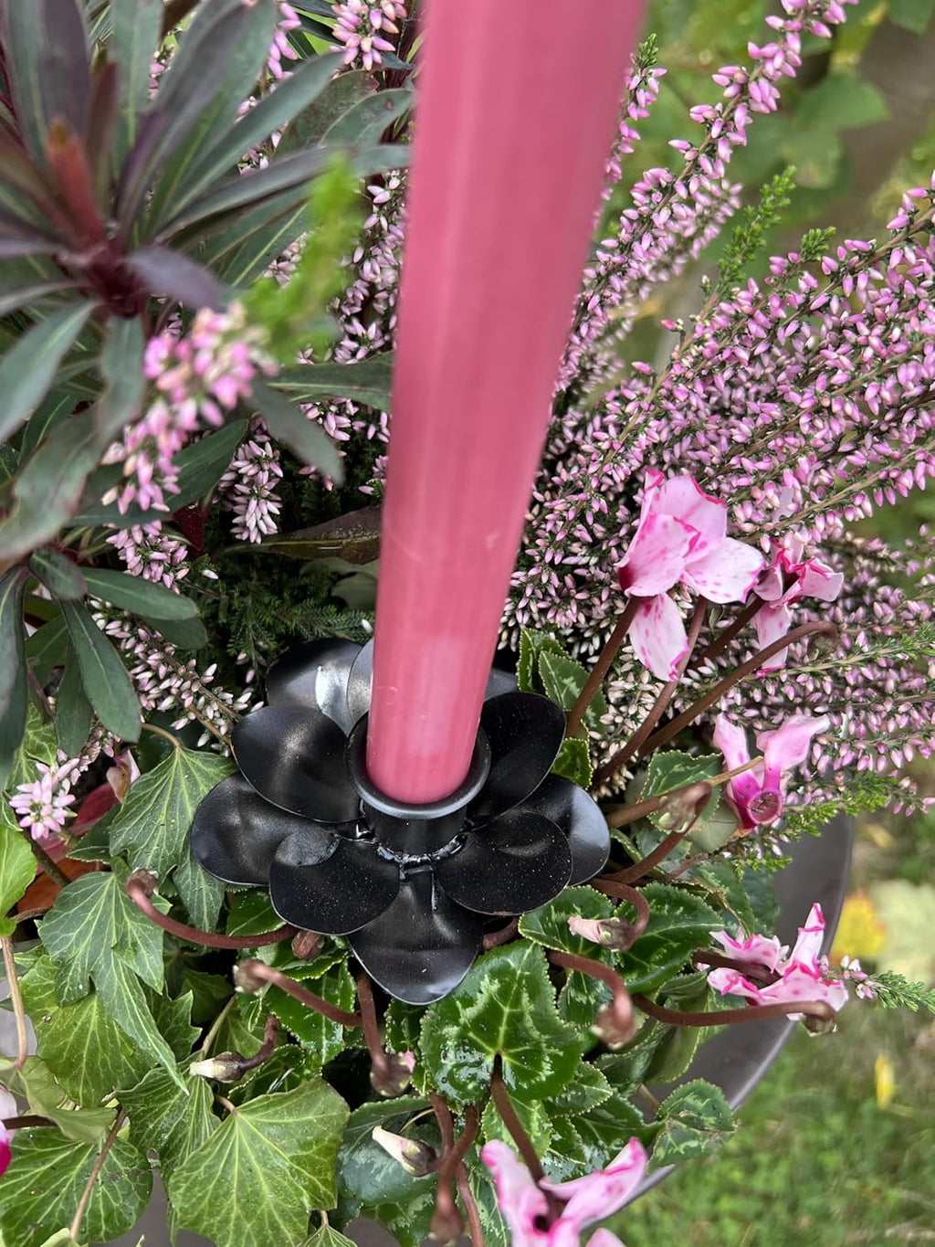 Dieser kunstvolle Kerzenhalter in Blütenform verleiht Ihrer Adventsdekoration eine besondere Note. Die filigrane Metallkonstruktion ist in zwei Ausführungen erhältlich: elegant schwarz lackiert oder mit charakteristischer Rostoptik, die jedem Arrangement eine rustikale, zeitlose Atmosphäre verleiht. Der Halter ist speziell für Stabkerzen konzipiert und lässt sich dank des integrierten Stabs mühelos in Adventskränze oder andere Dekorationen einstecken. Die blütenartige Gestaltung mit mehreren geschwungenen Metallblättern sorgt für einen stilvollen Lichteffekt und bietet gleichzeitig sicheren Halt für die Kerze. Ein vielseitiges Dekoelement, das sich perfekt für die Advents- und Weihnachtszeit eignet und Ihrem Kranz oder Gesteck einen besonderen Akzent verleiht. Die robuste Metallausführung garantiert eine langlebige Verwendung und macht den Kerzenhalter zu einem zeitlosen Begleiter für die festliche Jahreszeit.