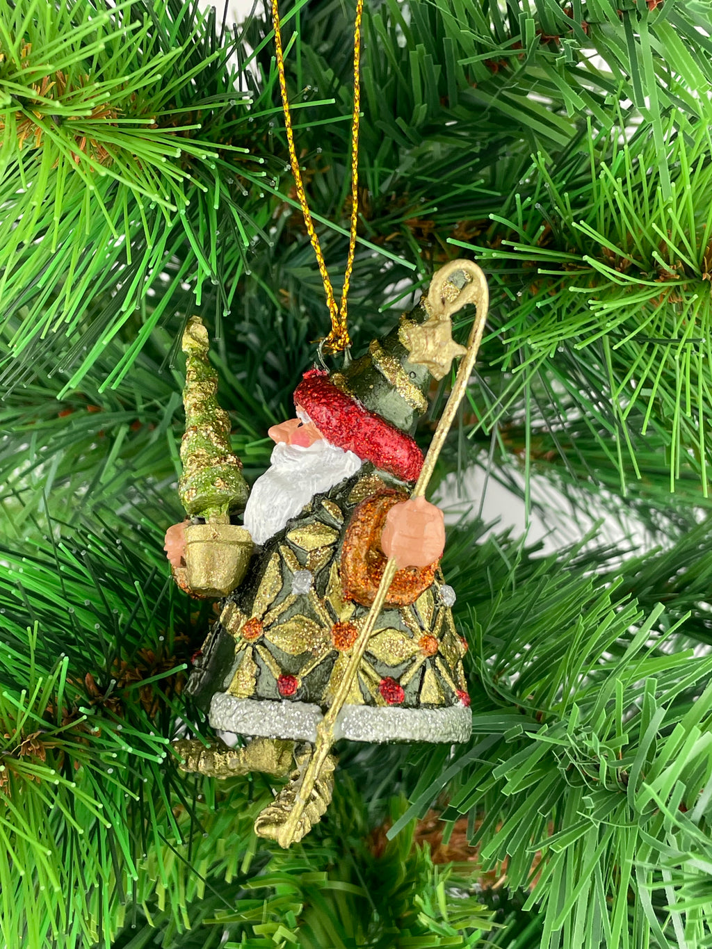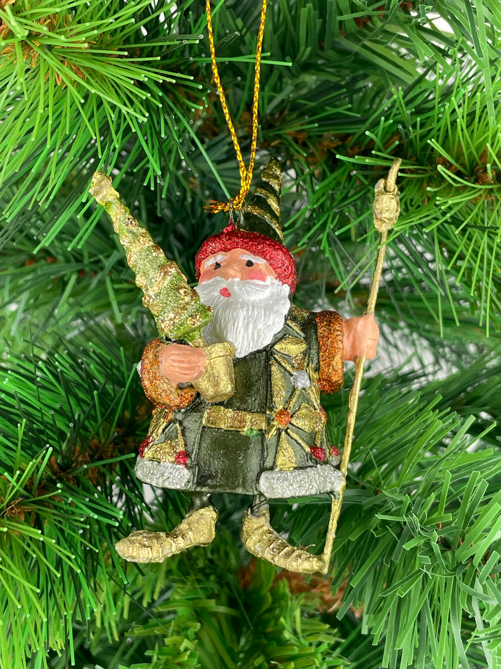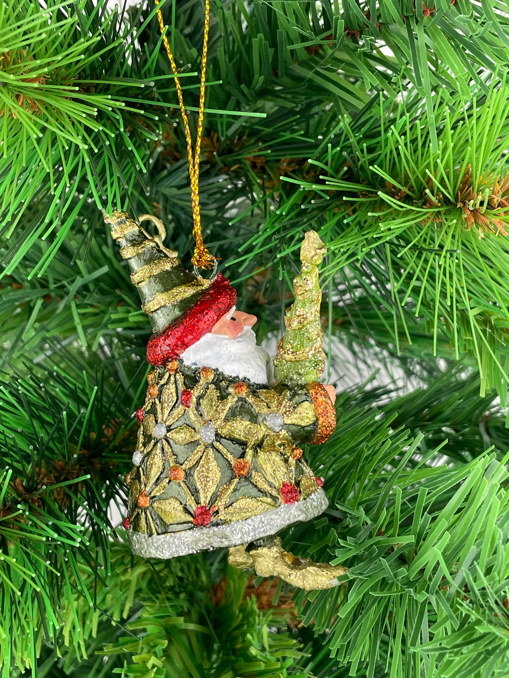 Dieser handbemalte Deko-Hänger zeigt einen kleinen Weihnachtsmann in einem dunkelgrünen Mantel mit Weihnachtsbäumchen und Stab. Mit einer Größe von 8 cm und einem goldenen Bändchen zum Aufhängen eignet sich diese kunstharzgefertigte Figur ideal als dezenter Christbaumschmuck. Das feine Glitzerelement unterstreicht die liebevolle Detailarbeit und verleiht Ihrer Weihnachtsdekoration eine elegante Note.