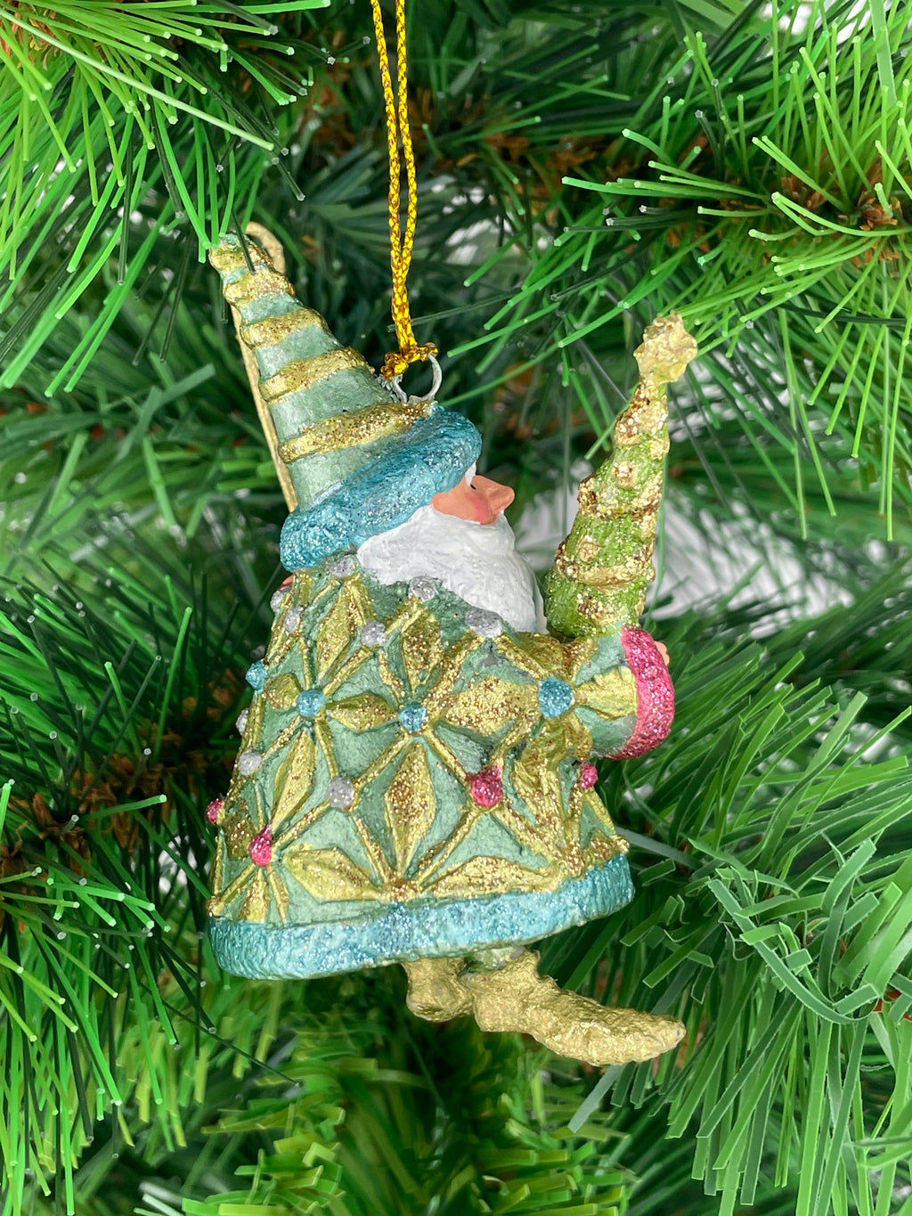 Dieser handbemalte Deko-Hänger zeigt einen kleinen Weihnachtsmann in einem pastellgrünen Mantel mit Weihnachtsbäumchen und Stab. Mit einer Größe von 8 cm und einem goldenen Bändchen zum Aufhängen eignet sich diese kunstharzgefertigte Figur ideal als dezenter Christbaumschmuck. Das feine Glitzerelement unterstreicht die liebevolle Detailarbeit und verleiht Ihrer Weihnachtsdekoration eine elegante Note.